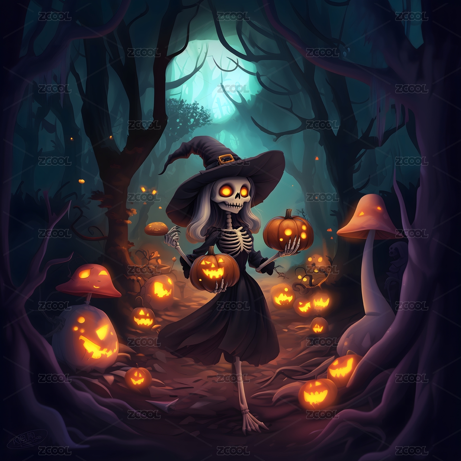 林中骷髅女巫持南瓜灯显诡异欢乐