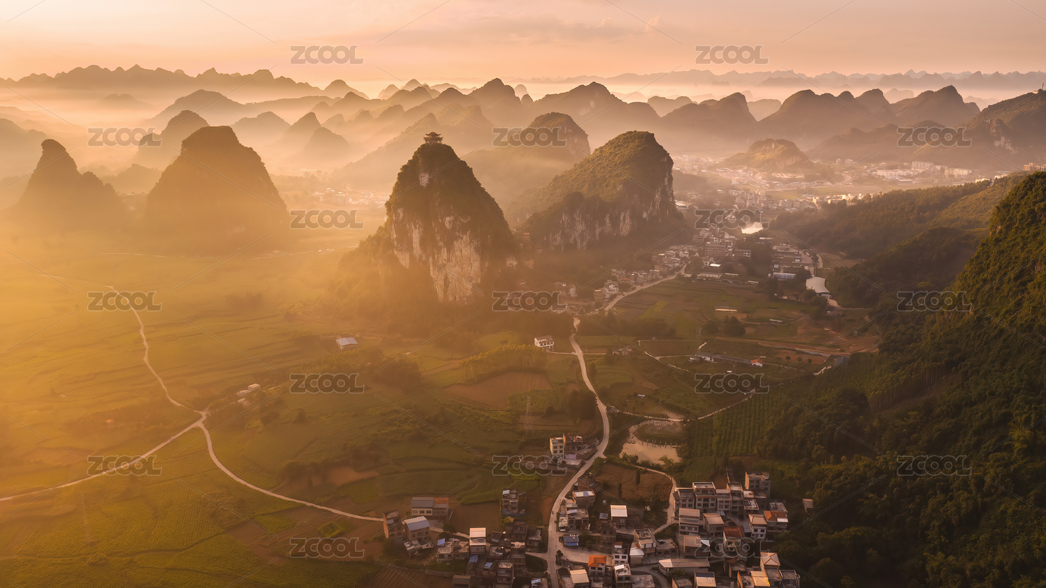 航拍中国广西桂林日出时喀斯特山脉晨雾风光