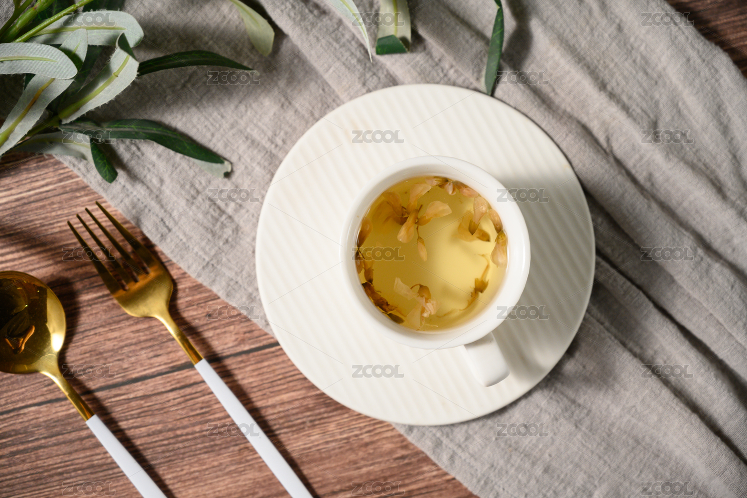 桌面上的杯子里的甘甜可口的玉兰花茶