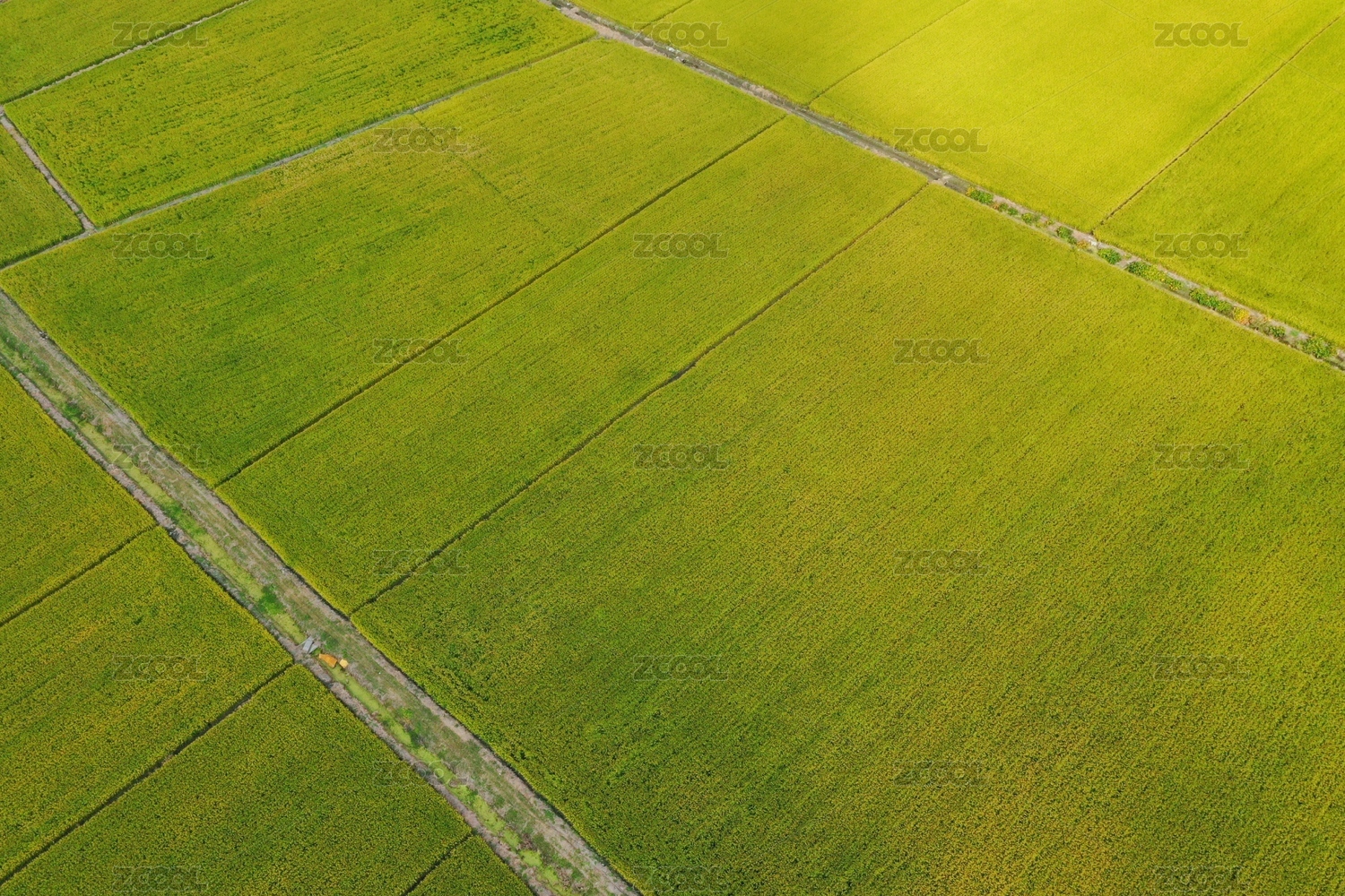 俯视航拍秋天金黄的稻田和小路