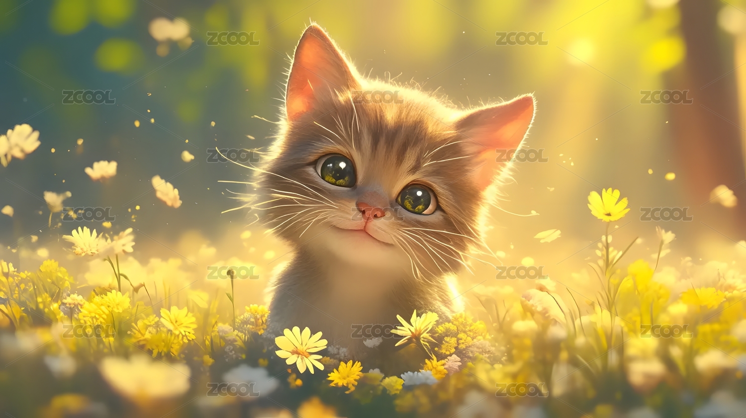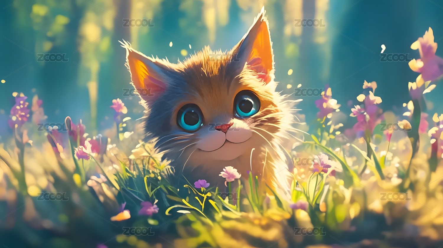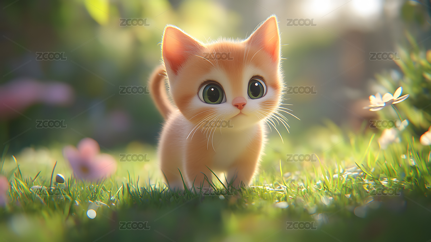 花丛中一只可爱的3D卡通小猫咪