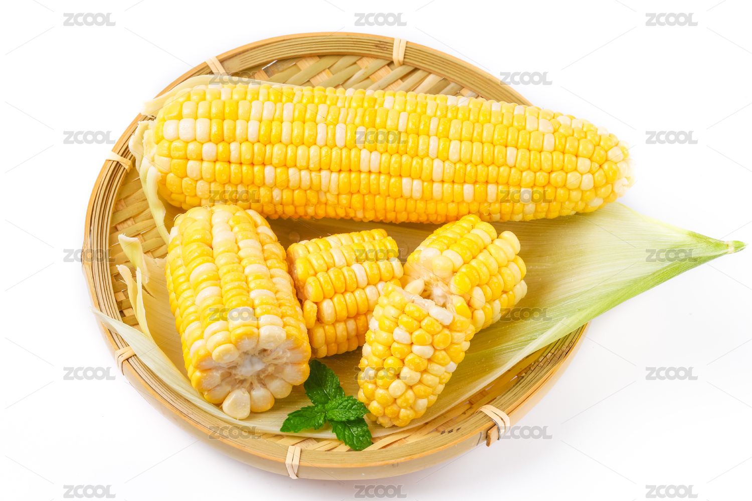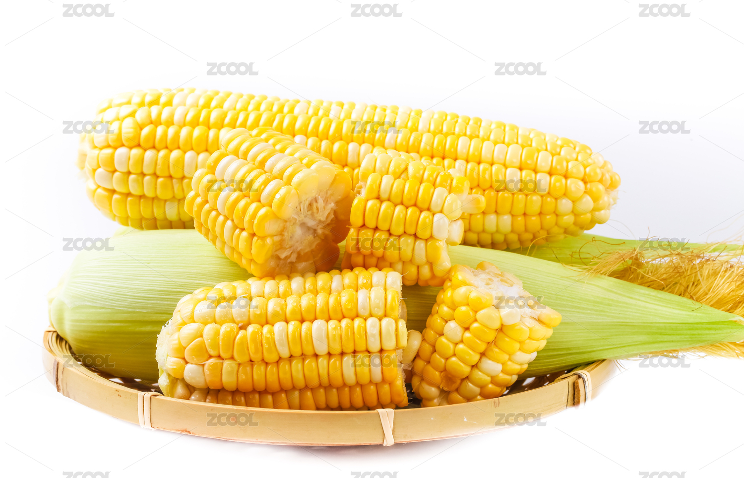 白底上竹筛子上的水果玉米段和一根玉米棒