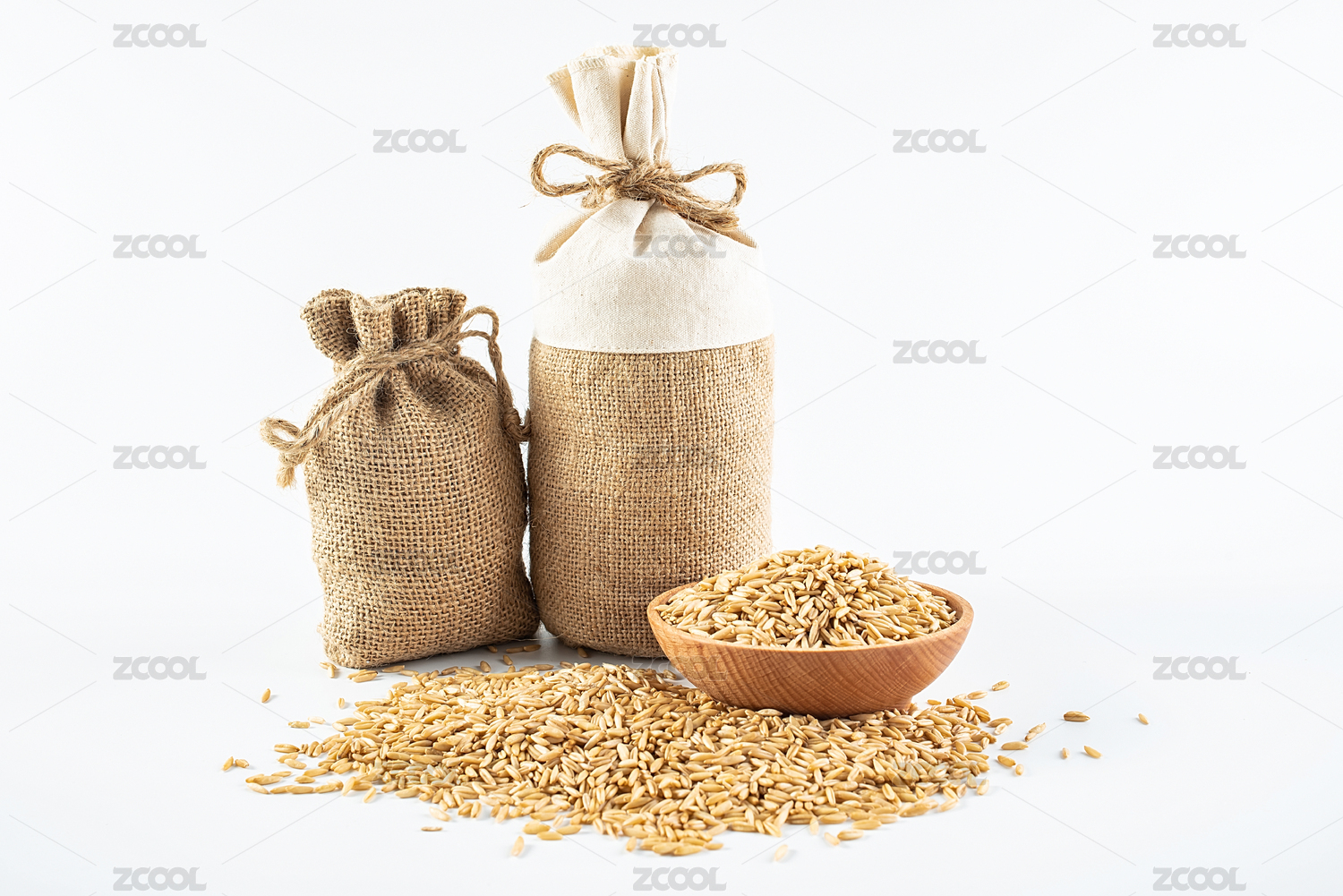 装满粮食的麻袋和一碗燕麦仁在白背景上