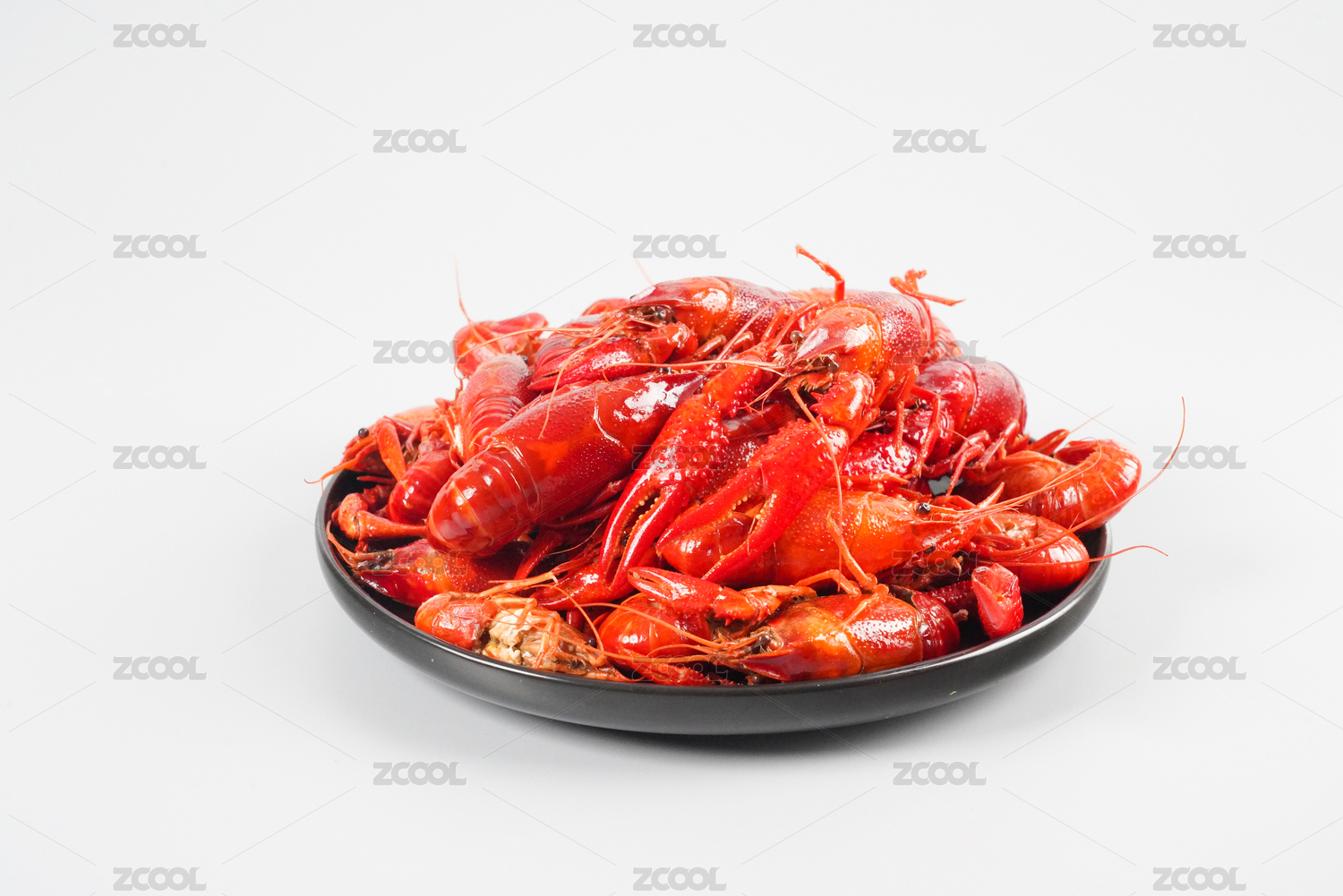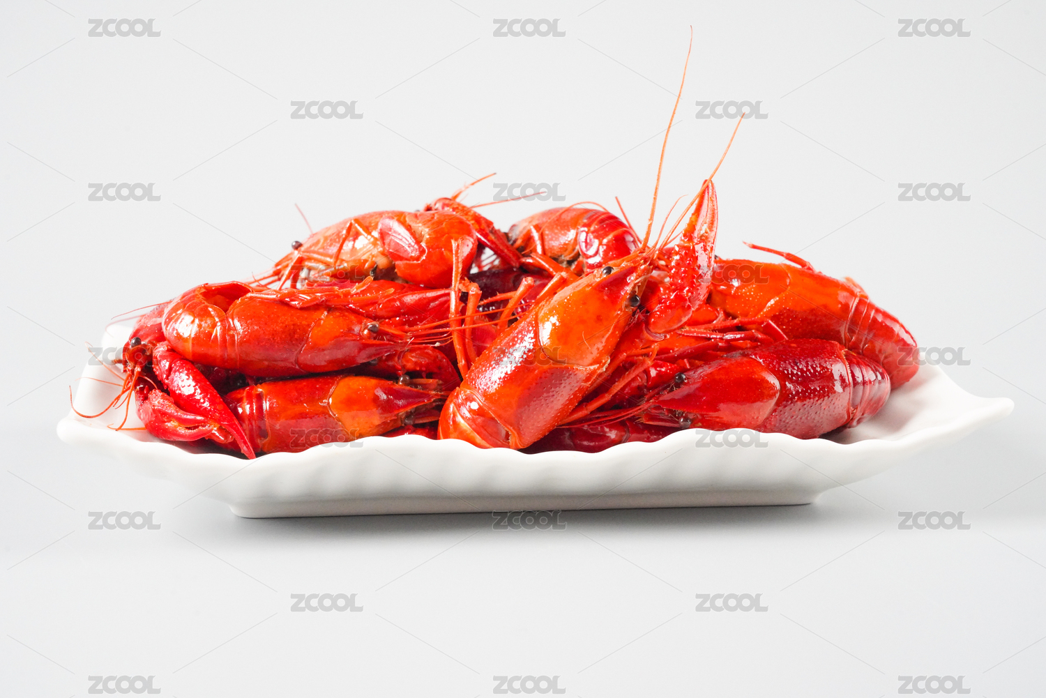 白色背景上一碟鲜红美味的小龙虾