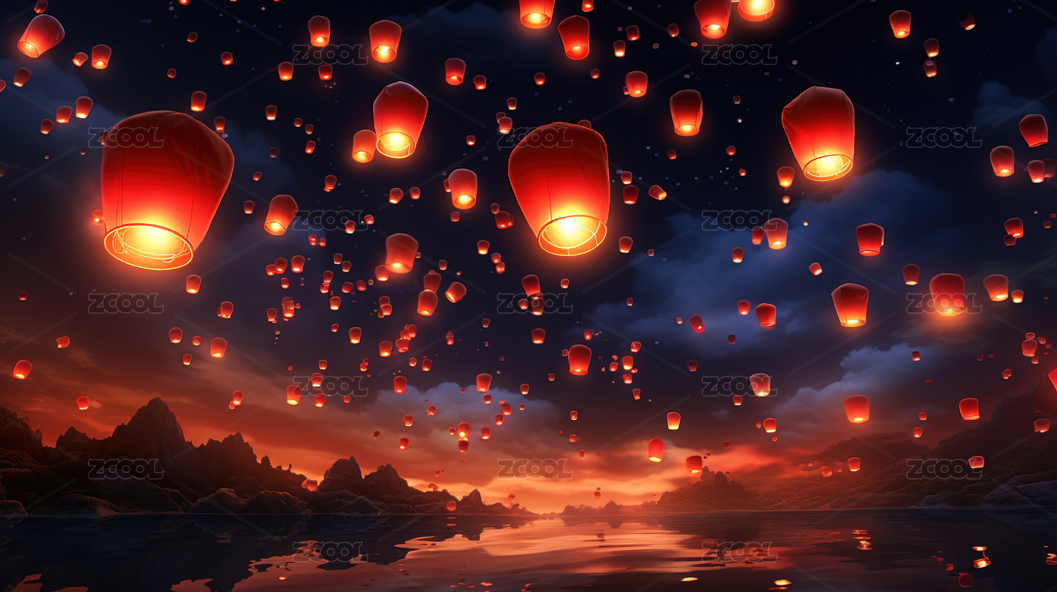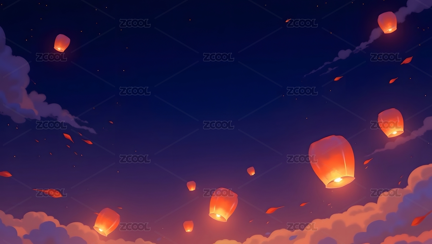 夜晚,放飞,漫天,孔明灯,祝愿灯,祈愿,插画