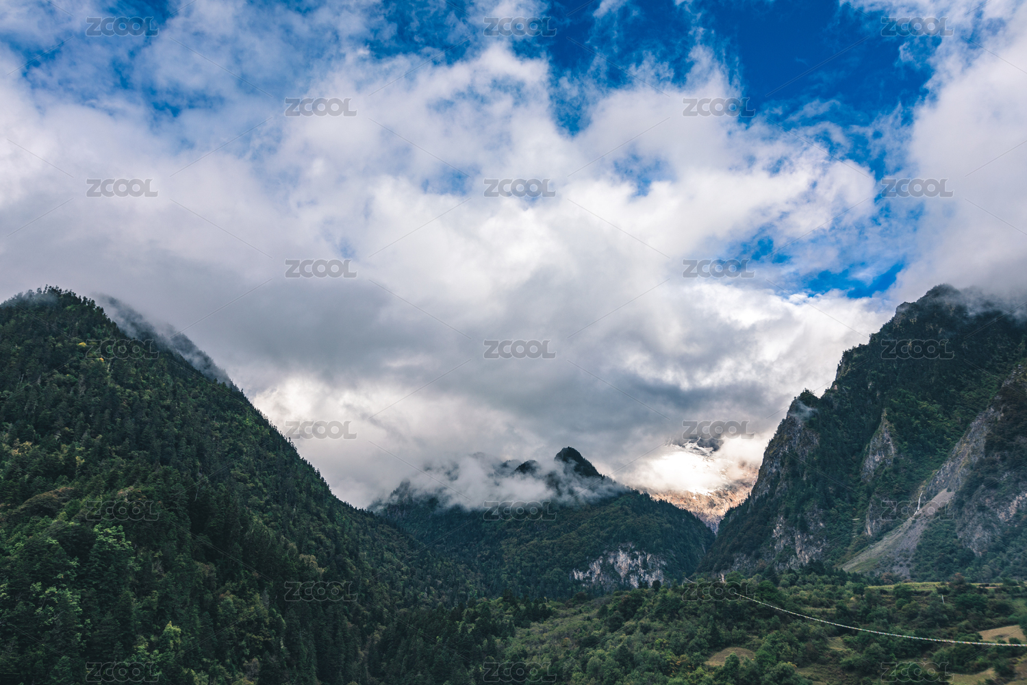 中国云南迪庆德钦县雨崩冰湖神瀑梅里雪山云雾缭绕