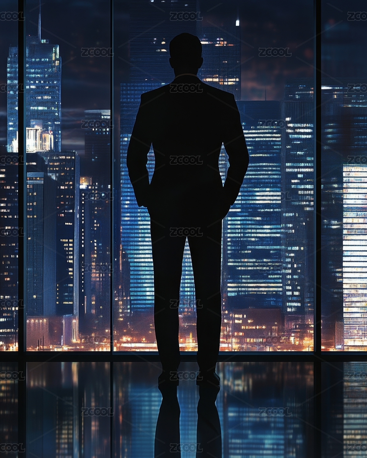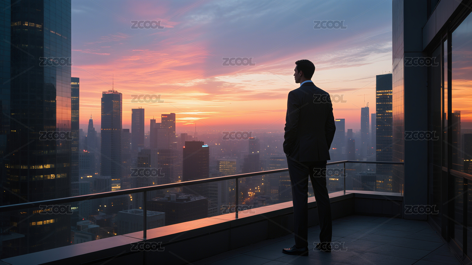 一位成功商业白领站在玻璃幕墙后边欣赏城市