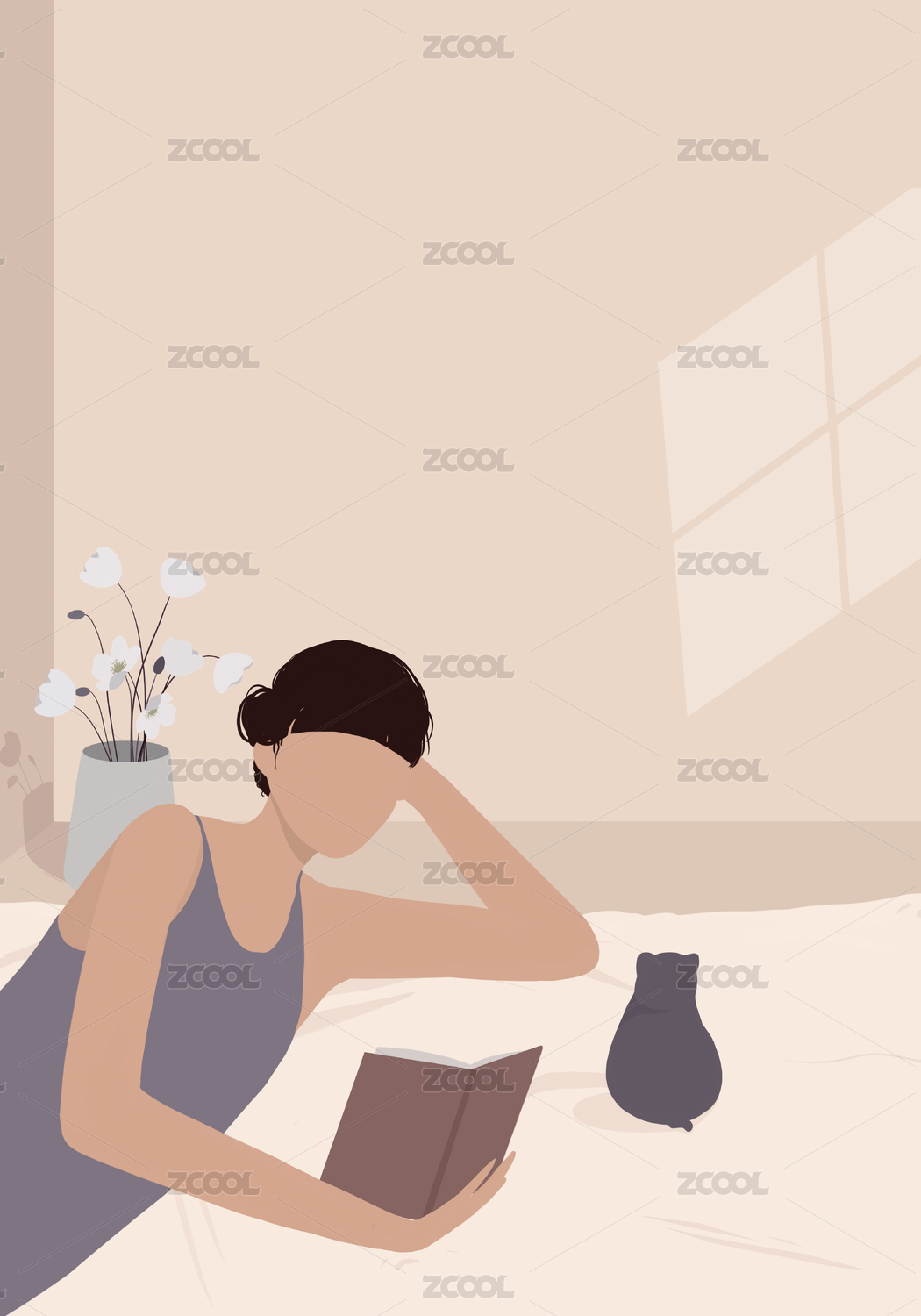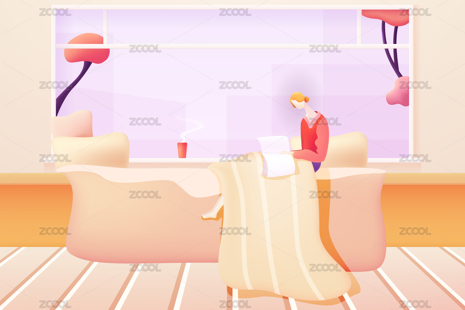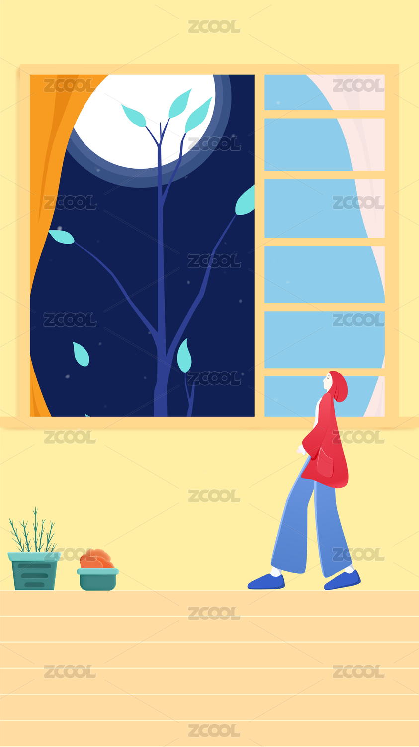 二十四节气小寒 下雪的冬天夜里 穿着红色衣服的女孩戴着帽子在温暖的室内看向窗外海报背景素材