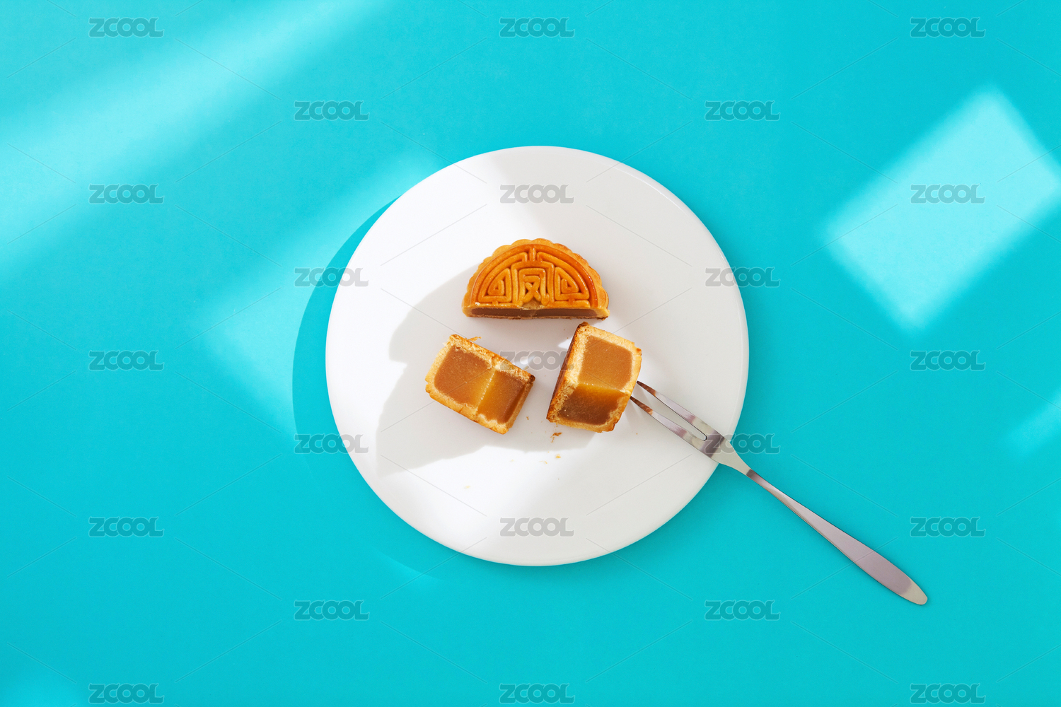 一个放着白色圆盘里的流心月饼,旁边还放着刀叉