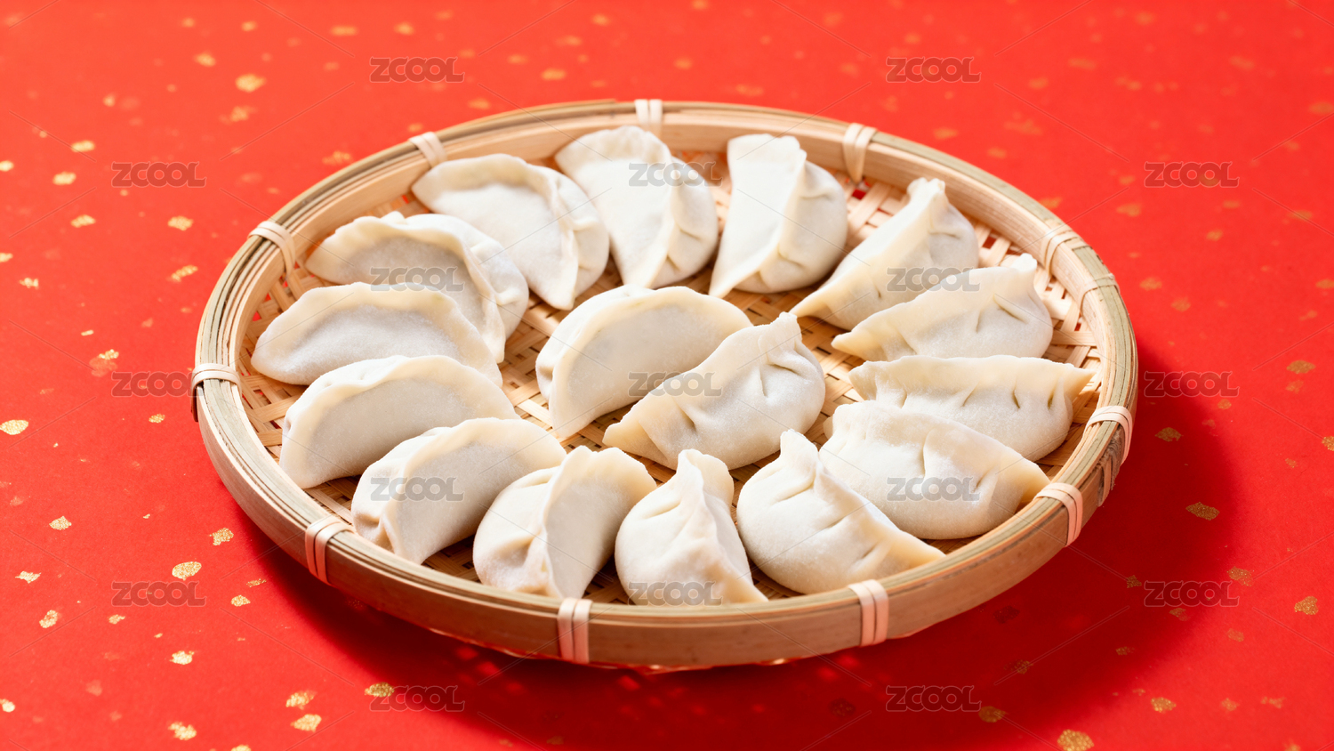 红色桌面上的一蒸笼中国春节年夜饭美食饺子
