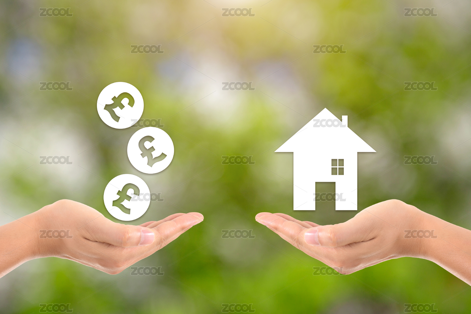 一只手托着虚拟的英镑硬币和另一只手托着虚拟的小房子进行交易