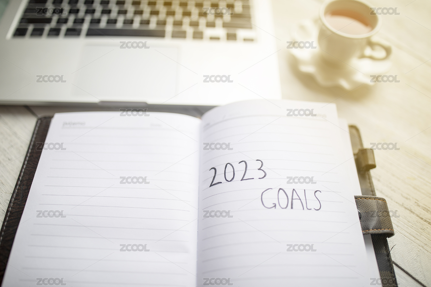 一个人用手拿着笔记本和钢笔在放着咖啡杯苹果电脑的书桌办公桌上写着自己的规划计划时间表