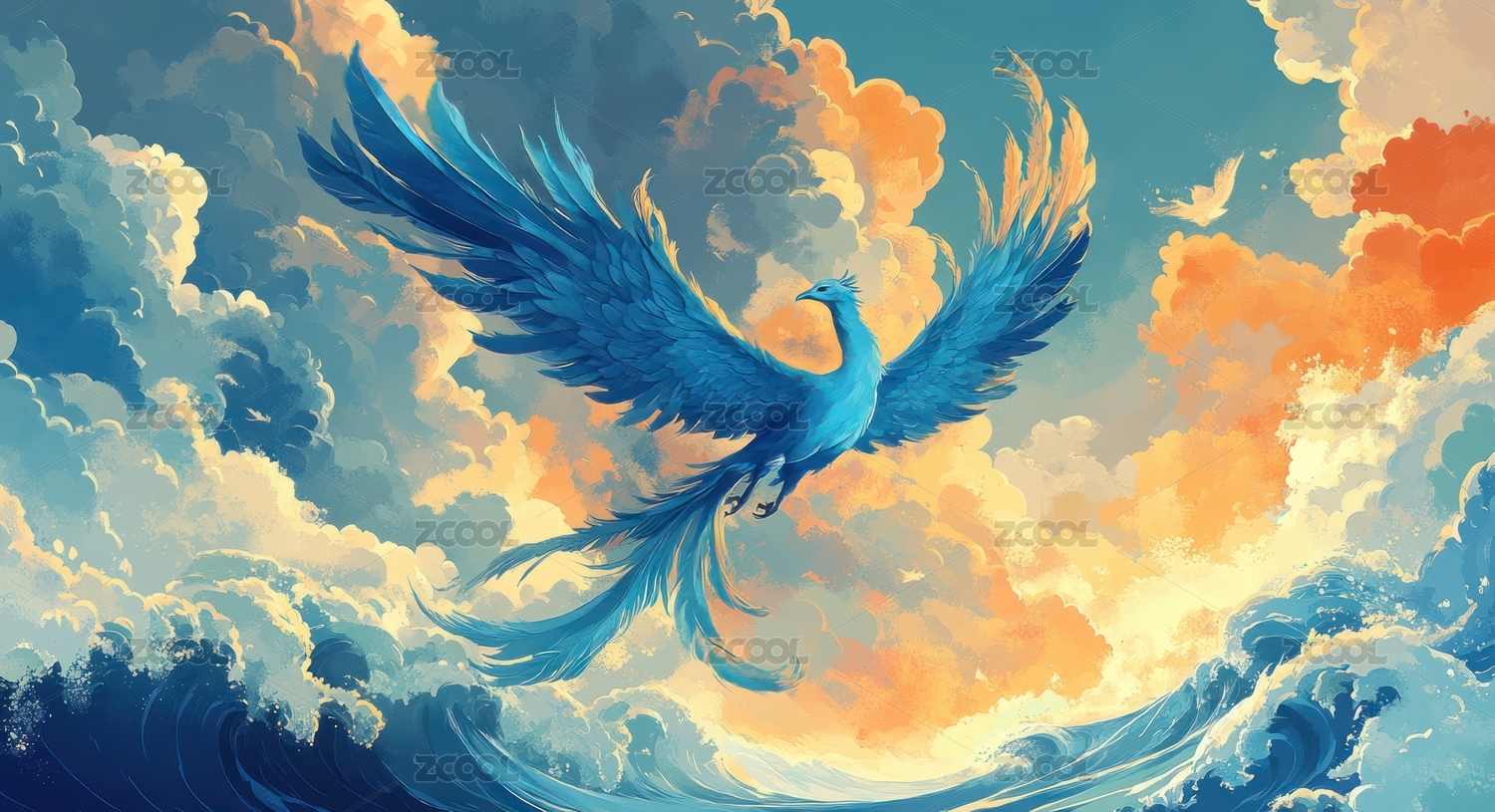 蔚蓝天空中展翅飞翔的金色鸟儿