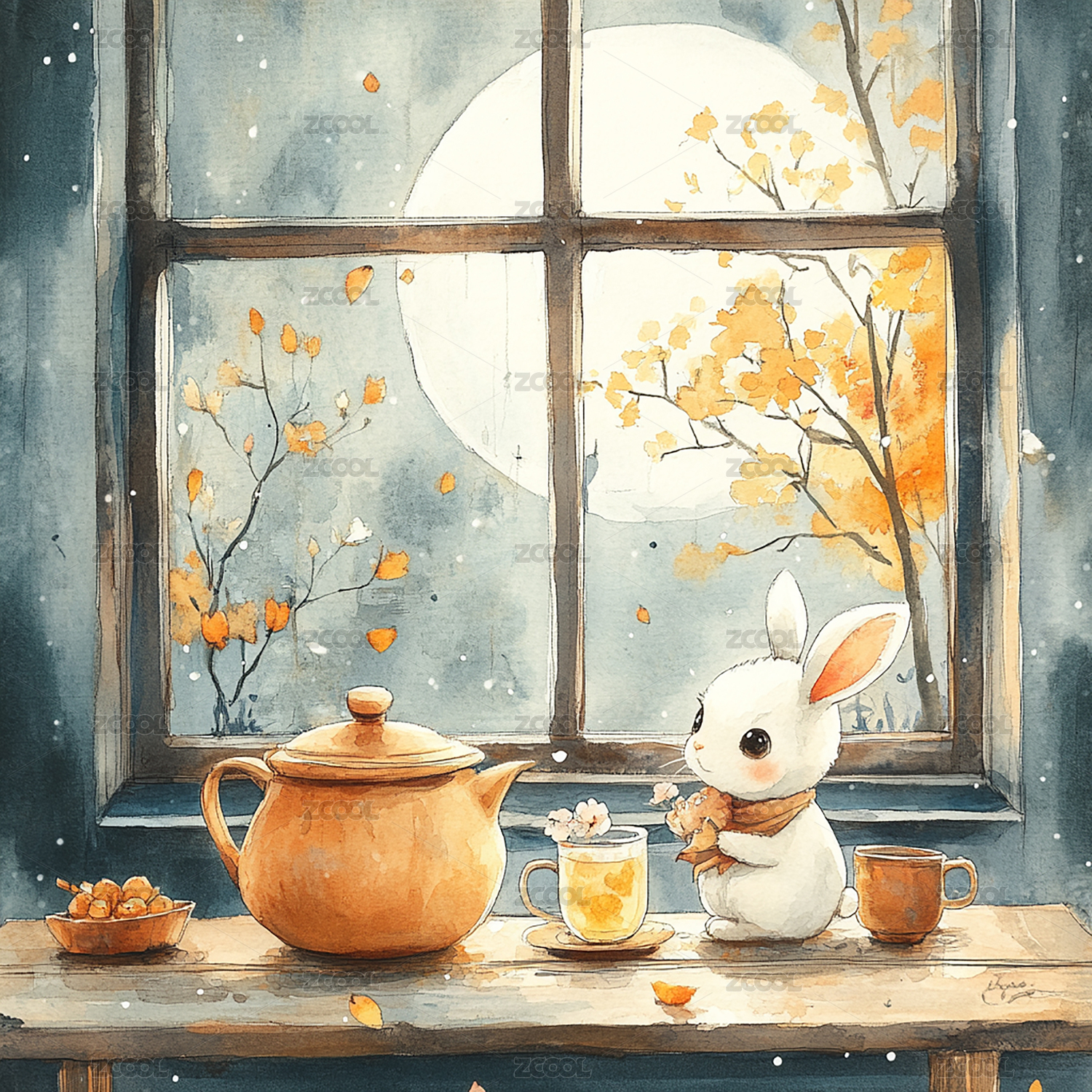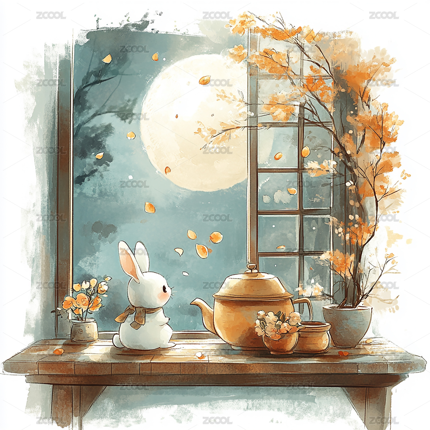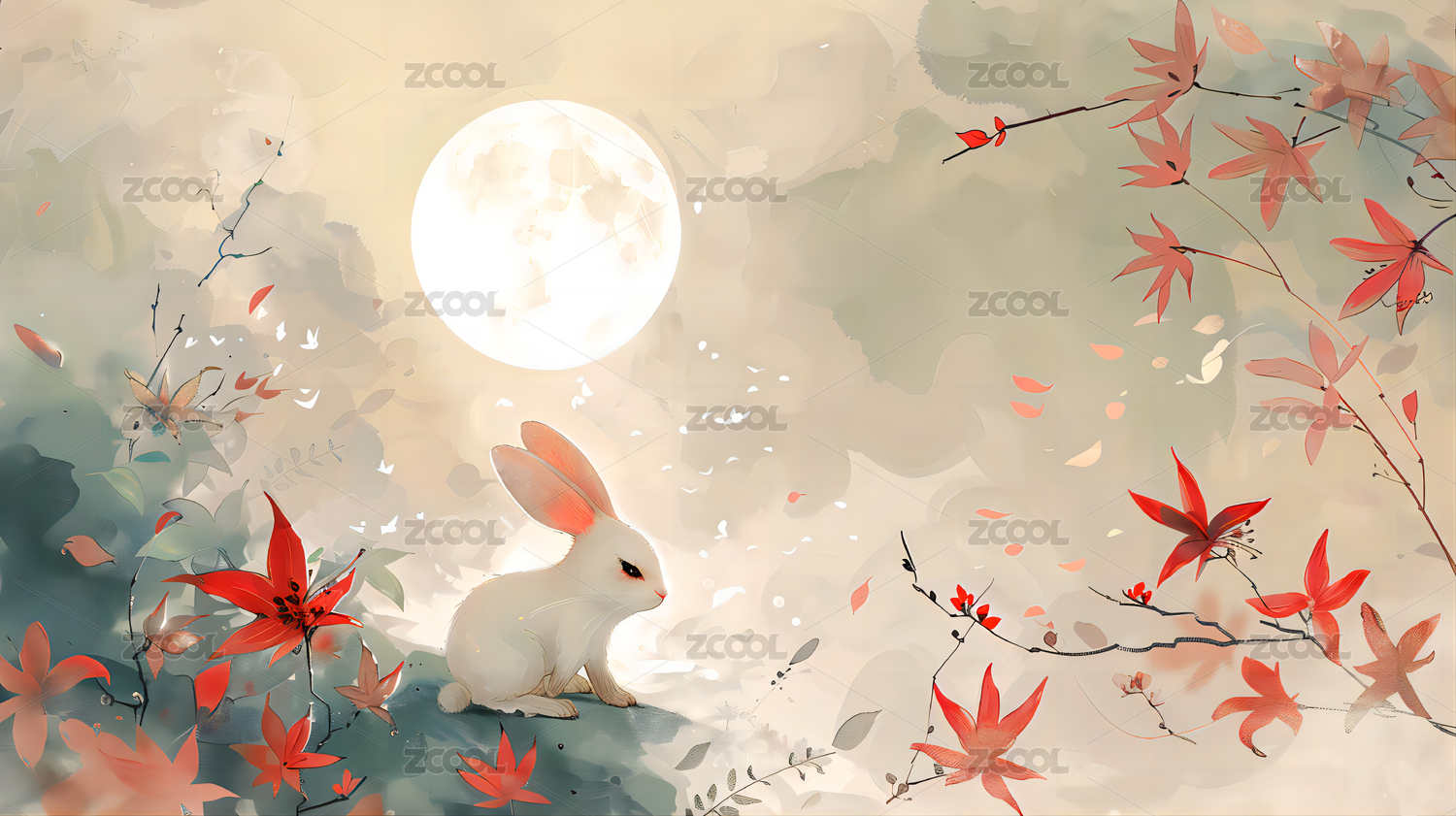 兔子玉兔月亮月饼桂花可爱新中式风格插画