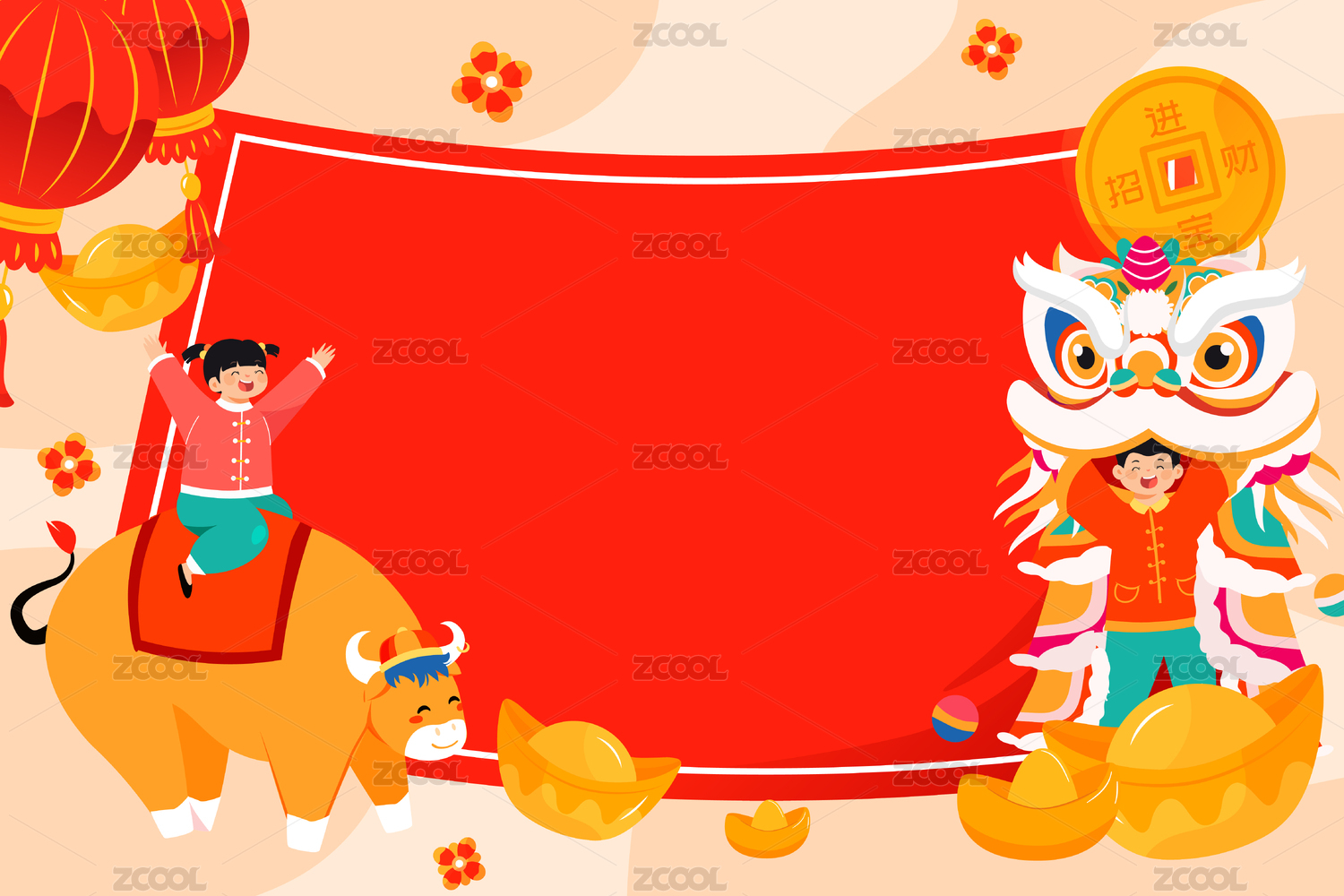 国潮风新年一只龙在舞狮和灯笼窗帘背景