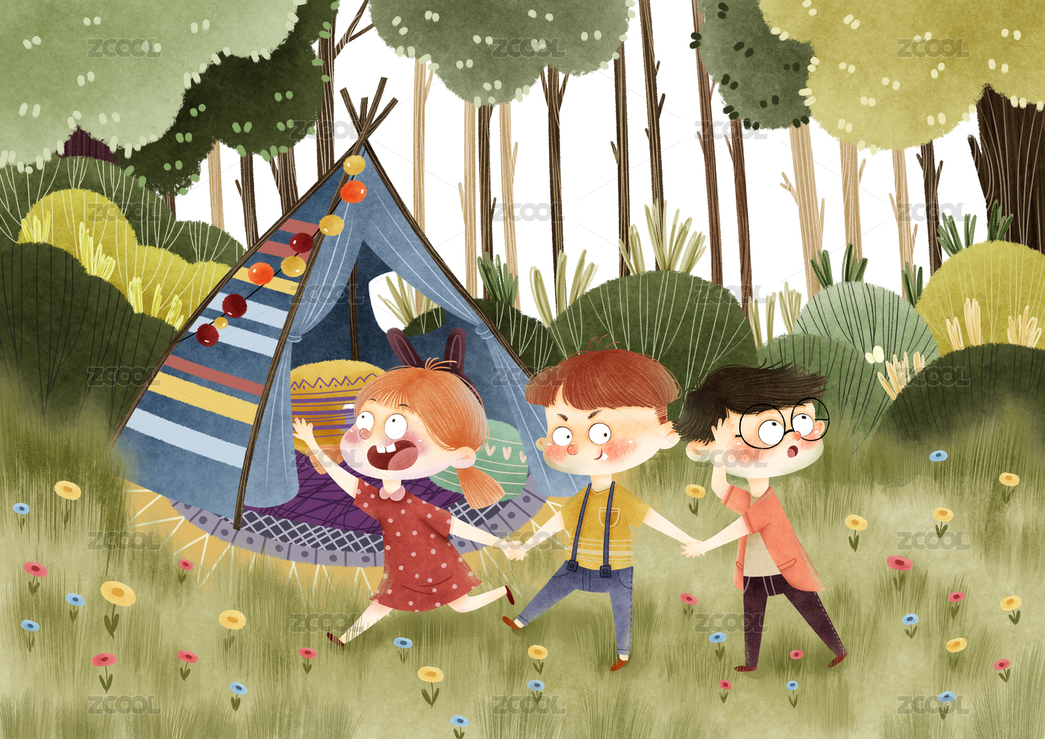 插画,儿童插画,儿童节,过节,发礼物,送礼物,森林,大熊,草地,蓝天白云