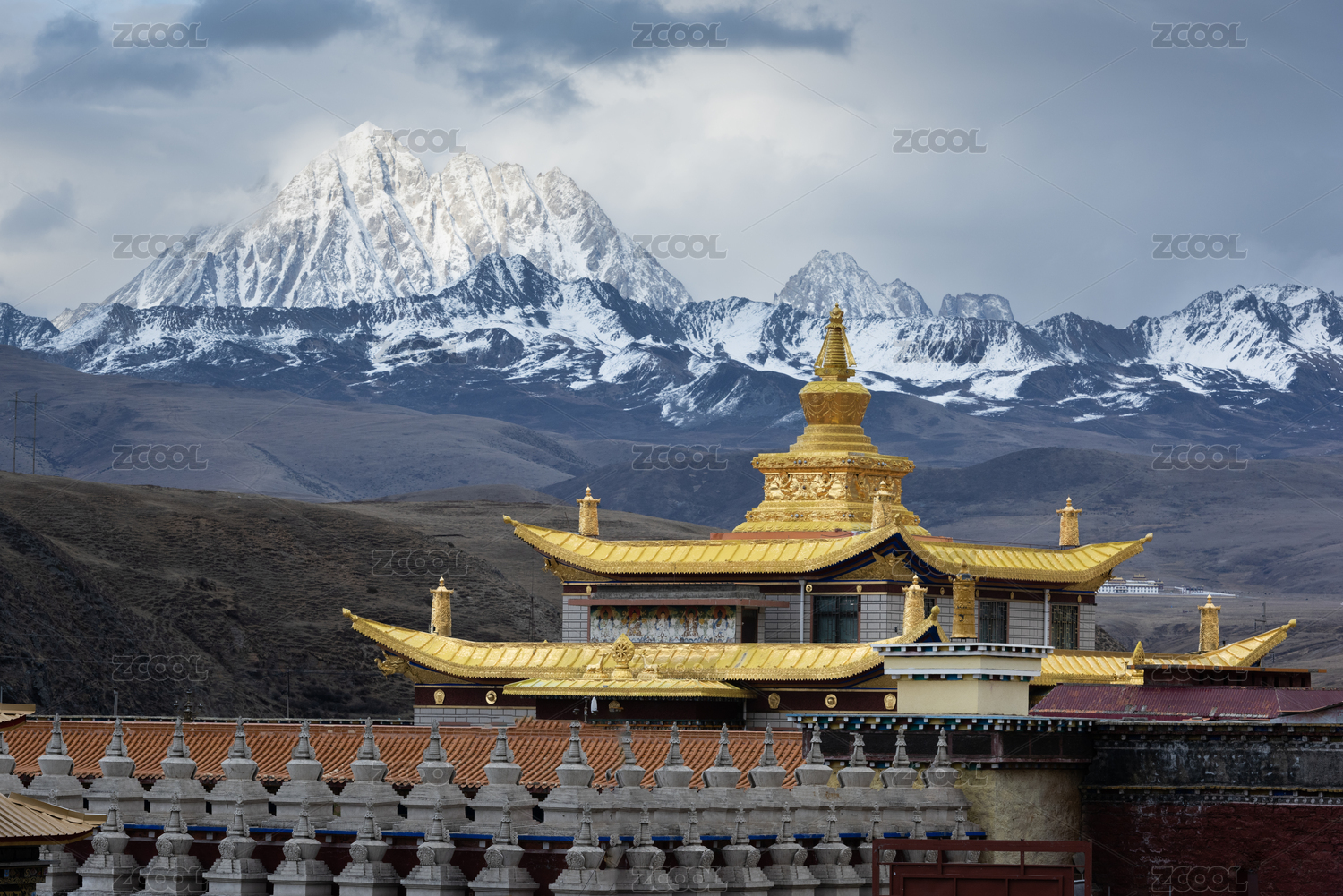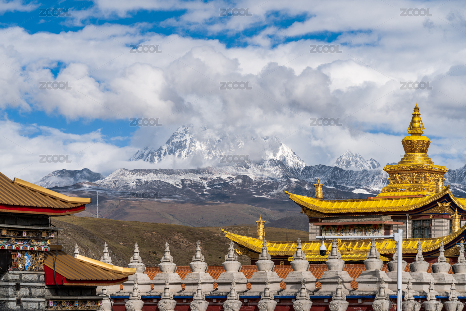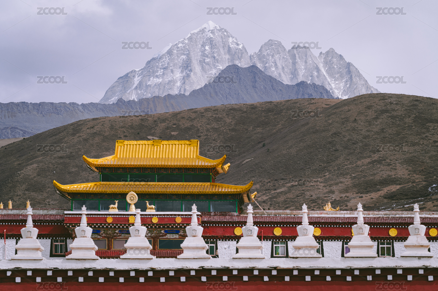 中国四川甘孜康定县塔公寺雅拉雪山自然建筑风光