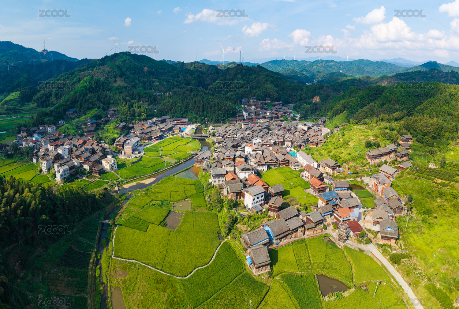 航拍湖南通道高步侗寨传统村落绿色稻田