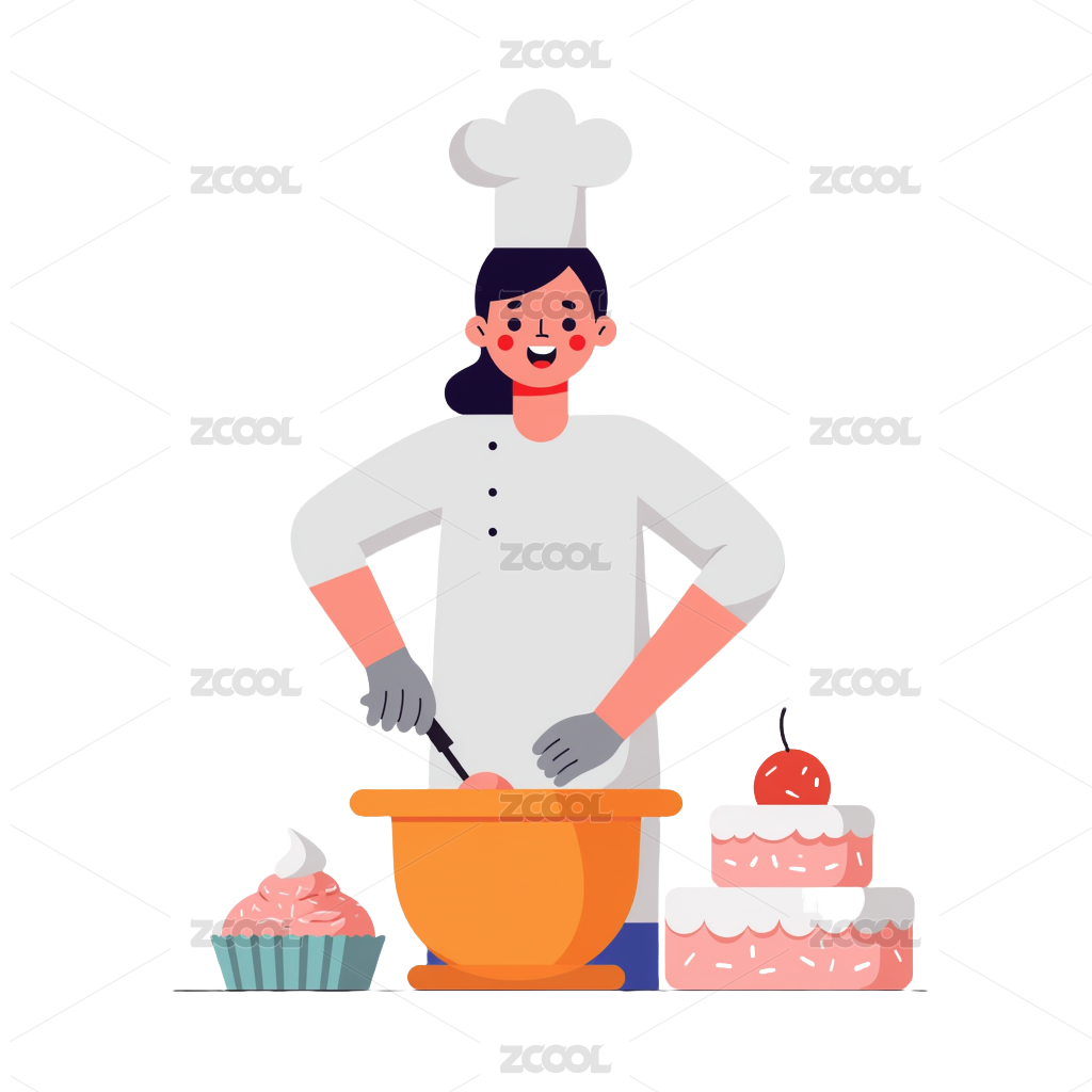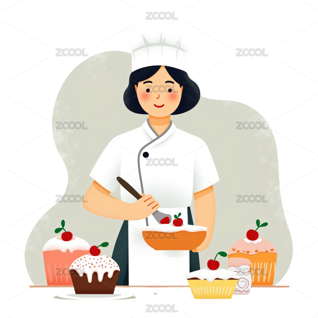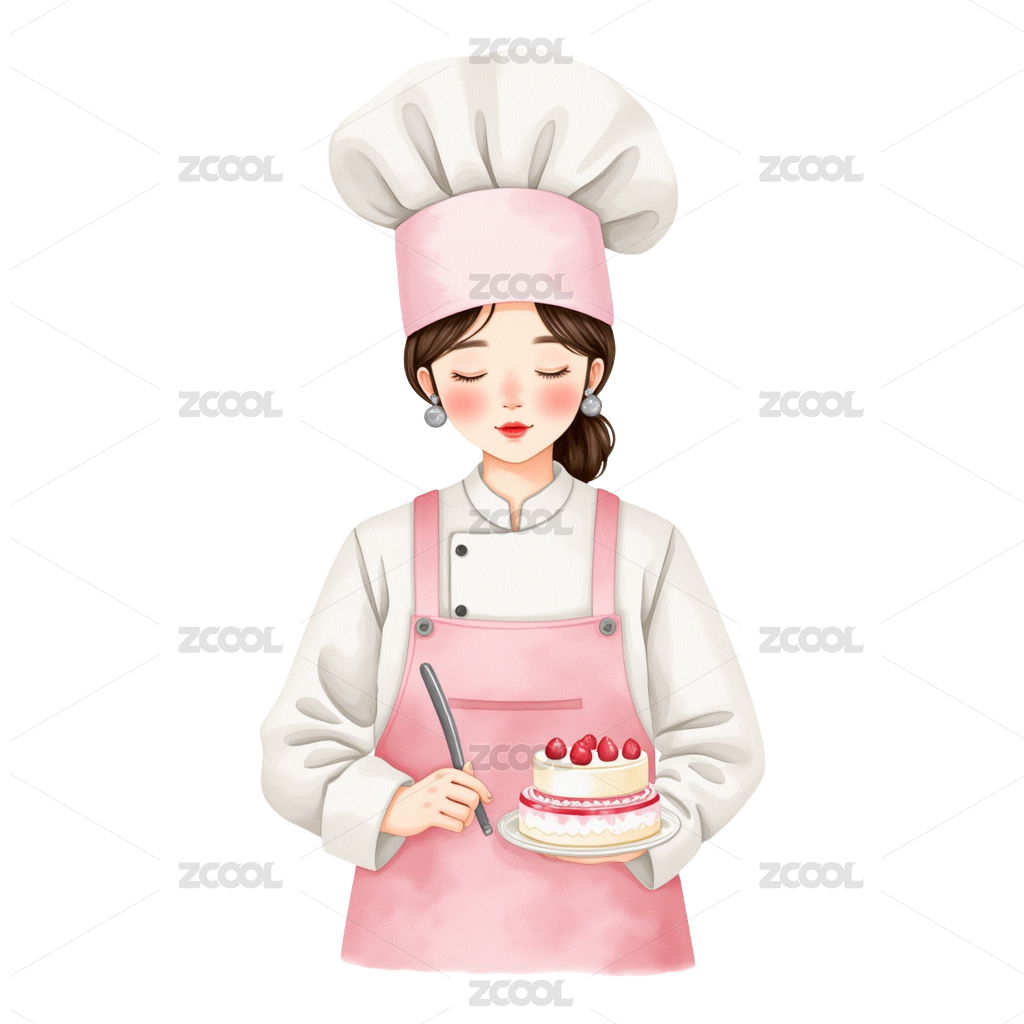 矢量,插画,短发,少女,粉色,围裙,蛋糕,食物,甜品,日常