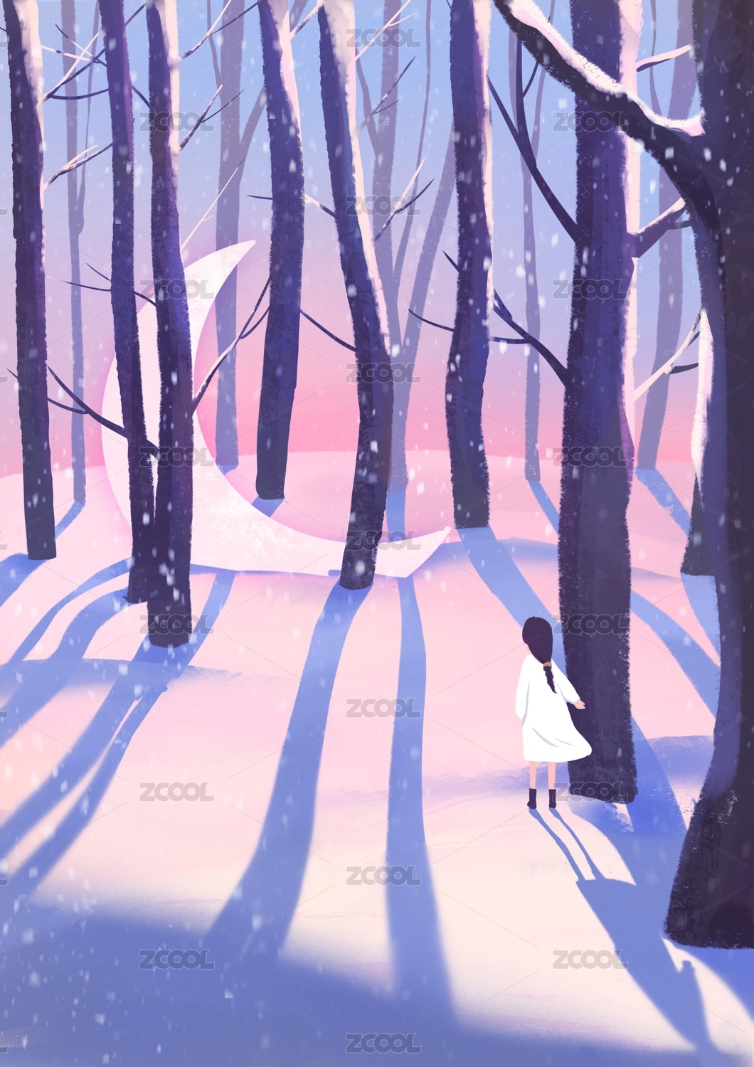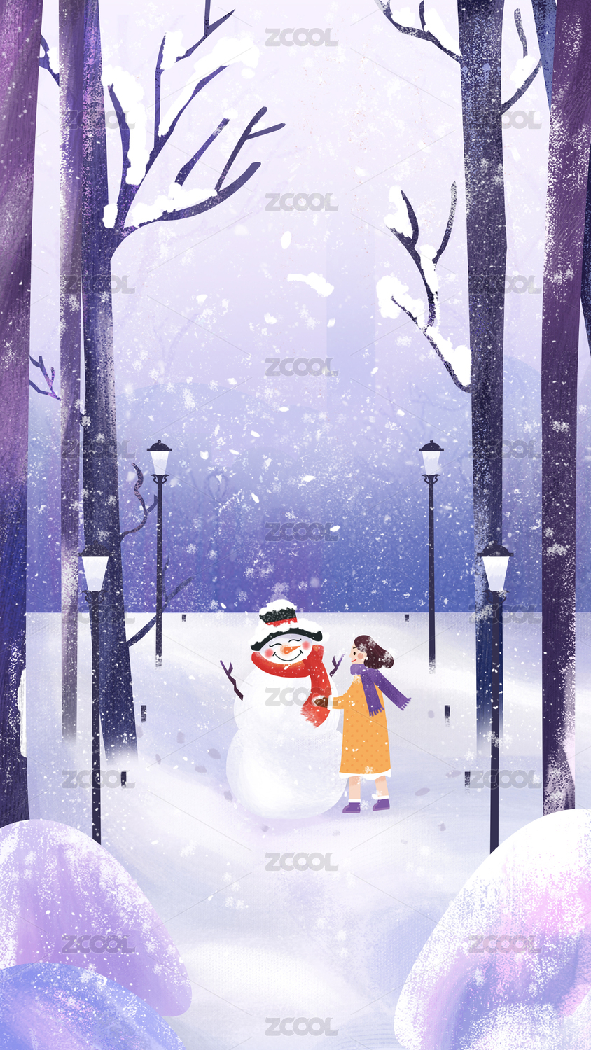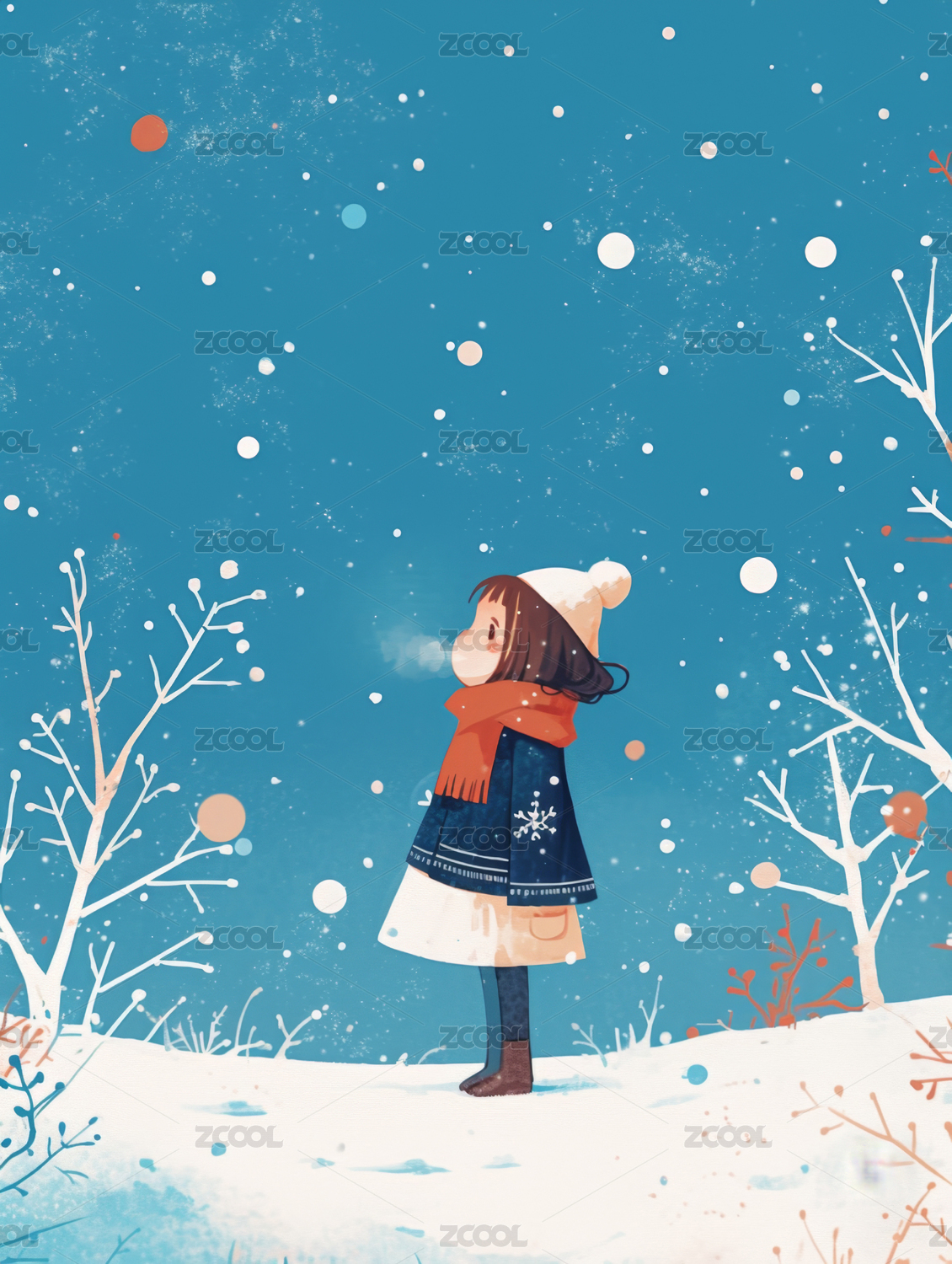 插画节气大雪小雪寒冷女孩冬天雪人树枝积雪