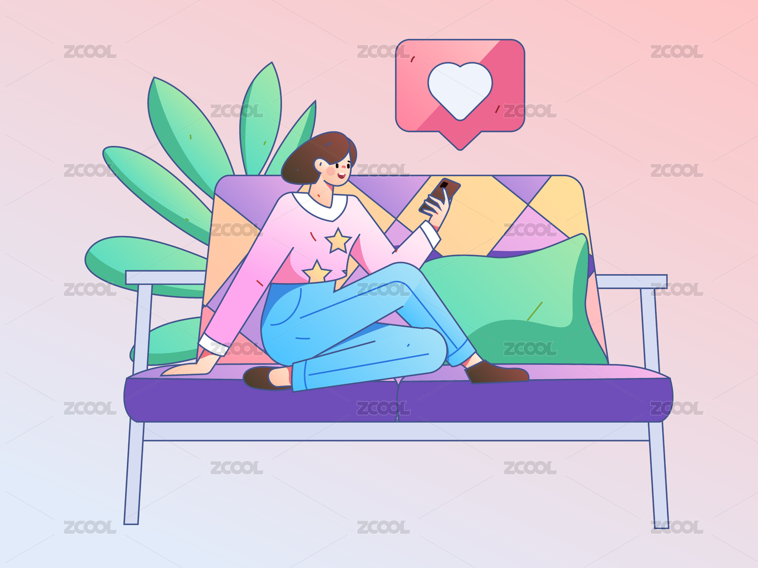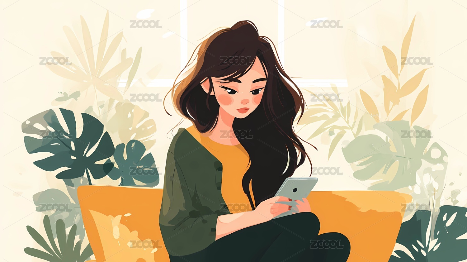 女孩在沙发上玩手机色彩插画