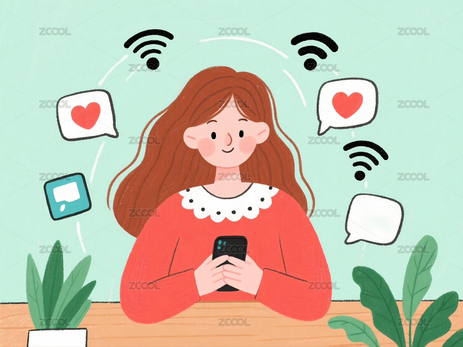 手机,玩手机,年轻,女子,插画,插图,扁平,风格,上网,商务