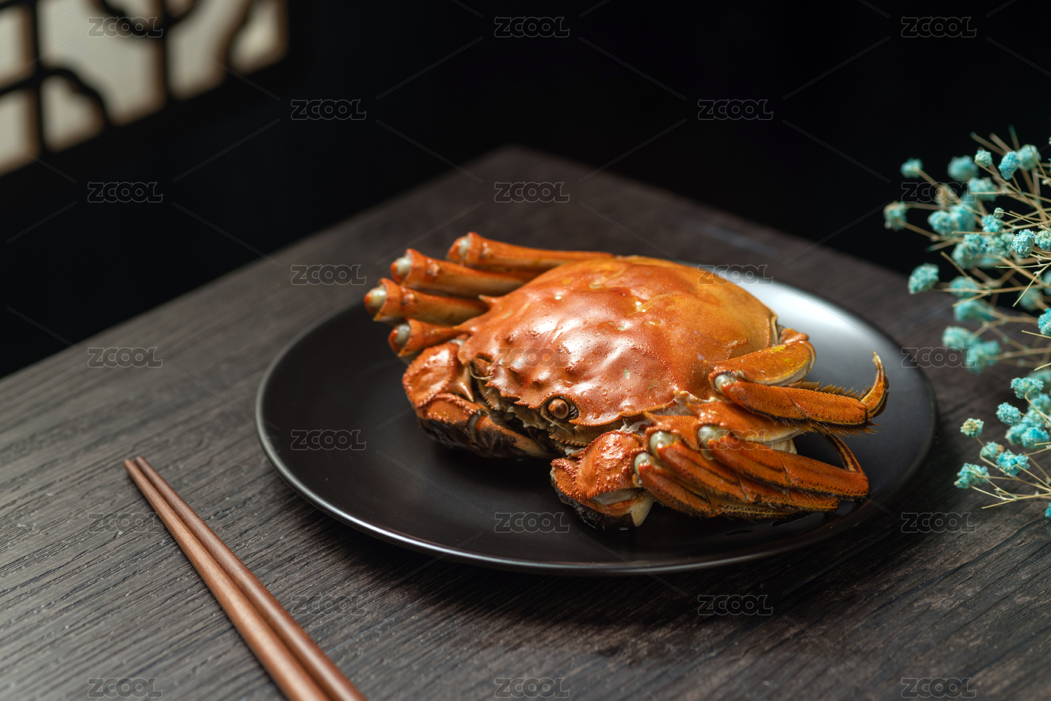 大闸蟹摆放在古窗棂背景木桌面上