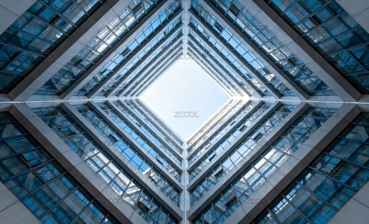 低视角现代建筑在蓝色调的玻璃屋顶。