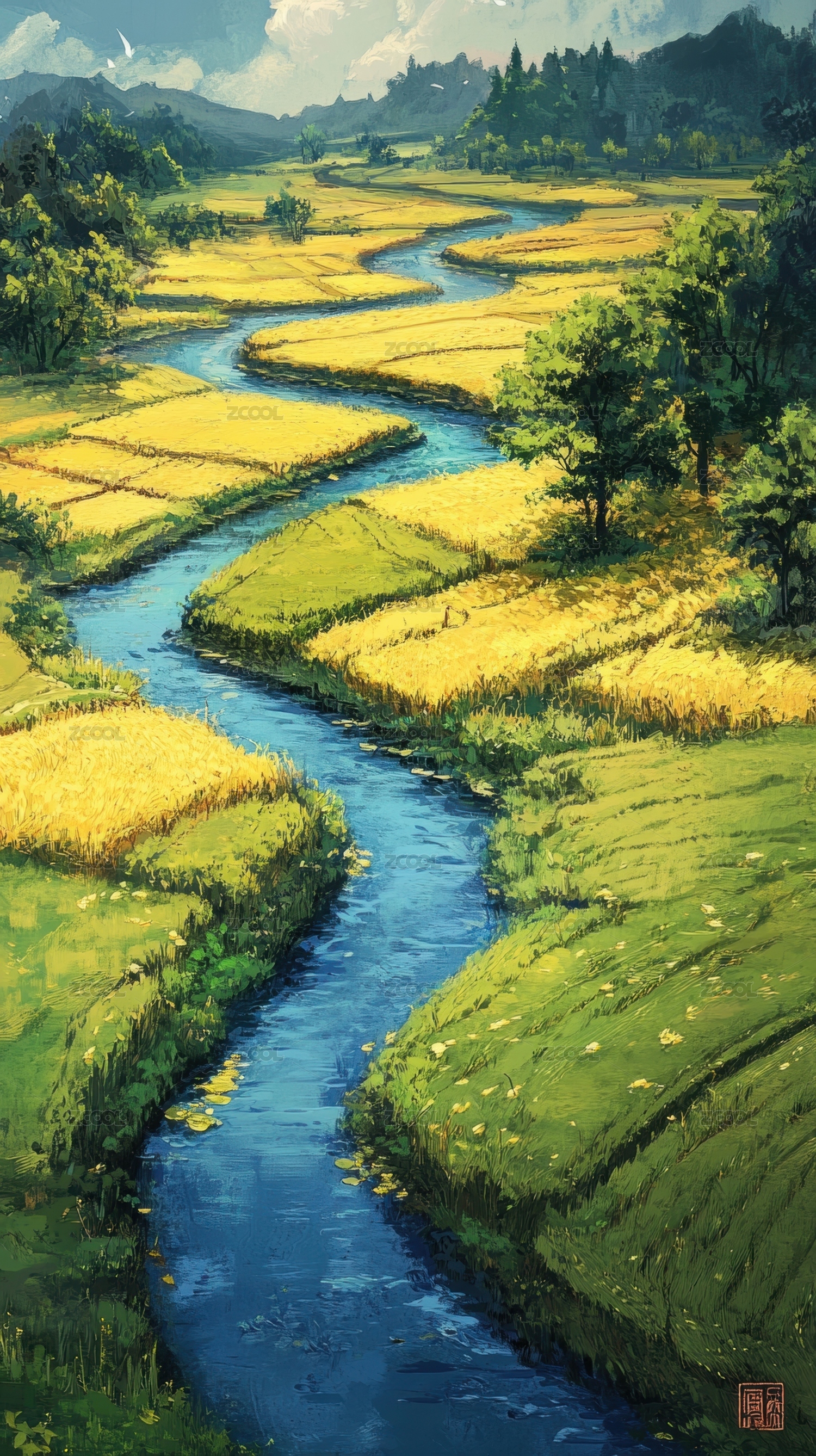 黄色田野中的蜿蜒小溪