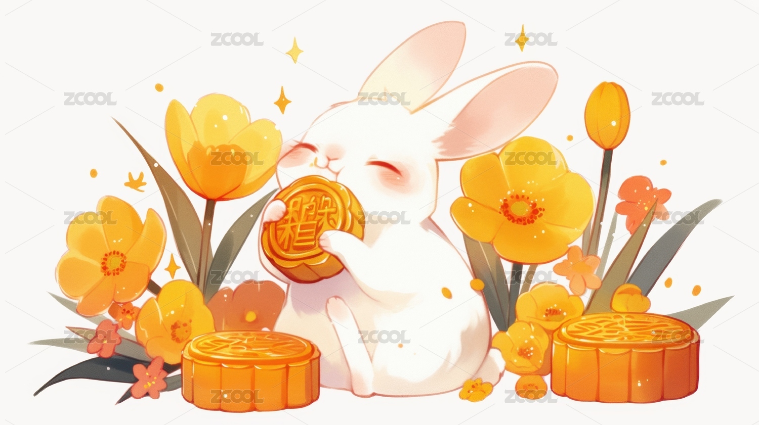 AIGC202403,玉兔,月饼,兔子,兔,插画,背景,卡通,扁平,节日