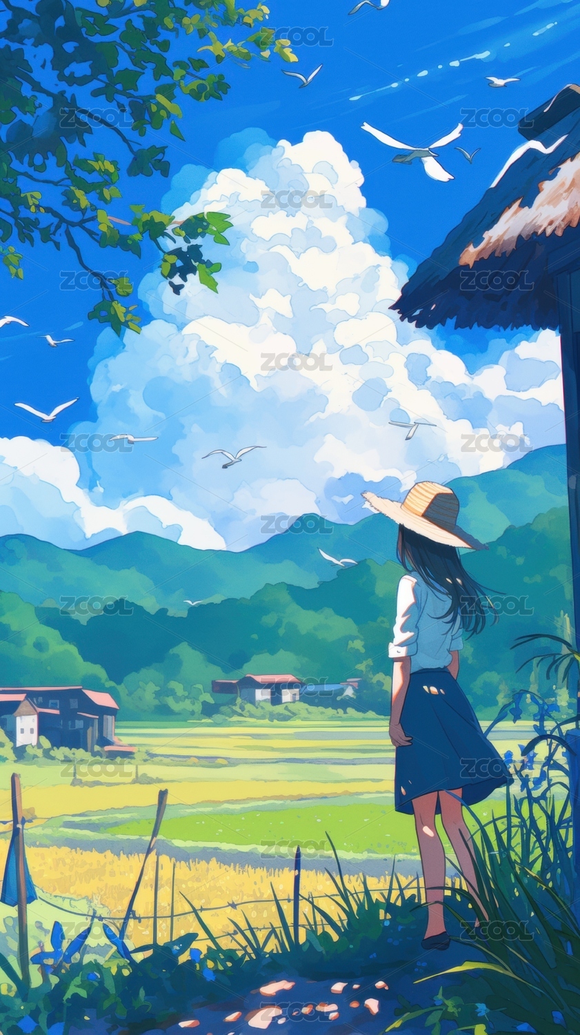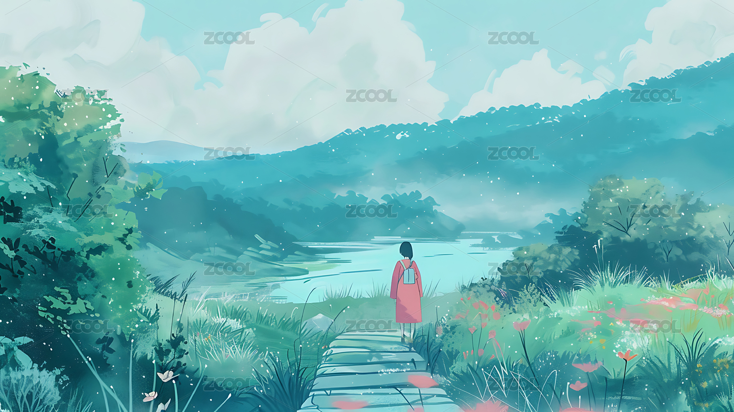 绿绿的草地上有个穿白裙子的女孩站在大树下