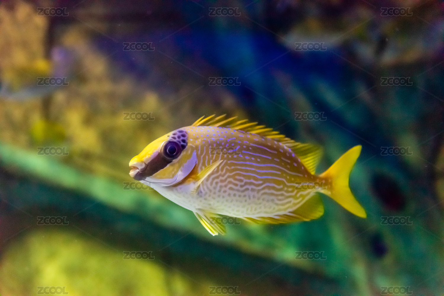 海洋馆水族箱中自由游弋的蓝尾箱魨