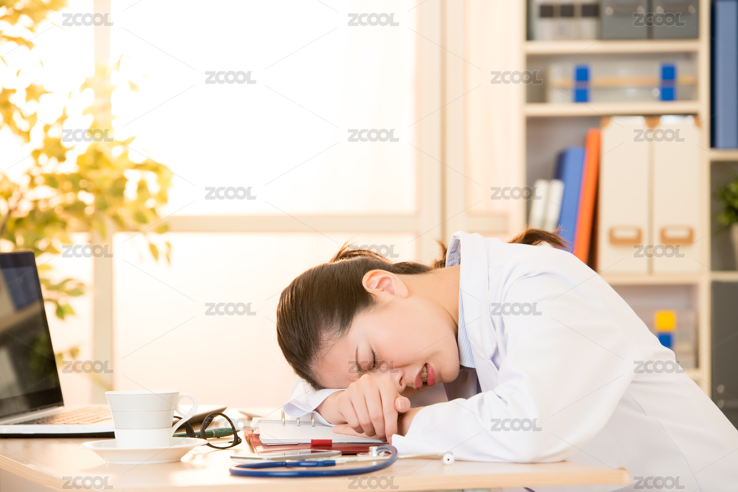 筋疲力尽的医务人员在深夜与夜班后咖啡睡觉。漂亮的混血亚洲的中国女人模型。医疗和健康理念