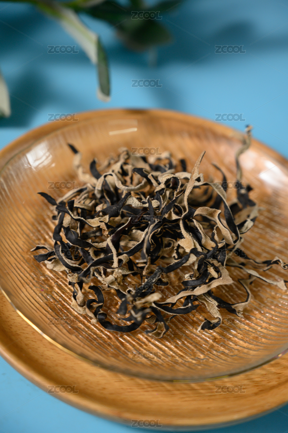 桌面上的盘子粒的干爽的干木耳丝