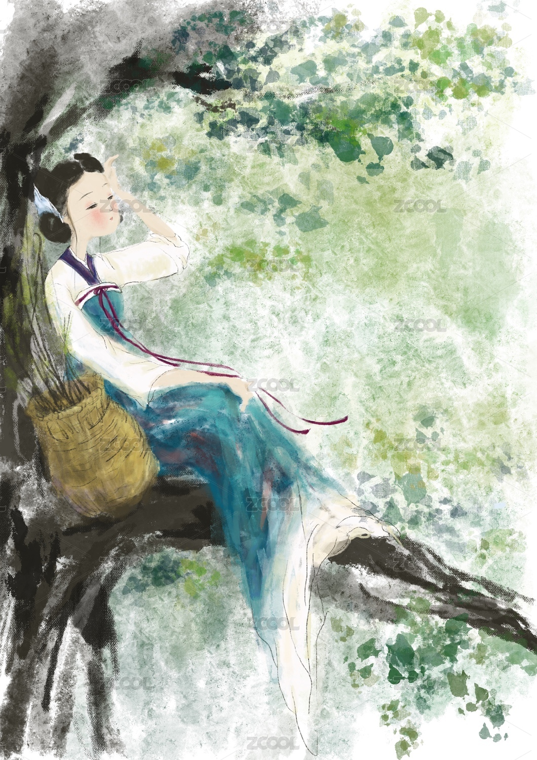水墨风在树上的小孩