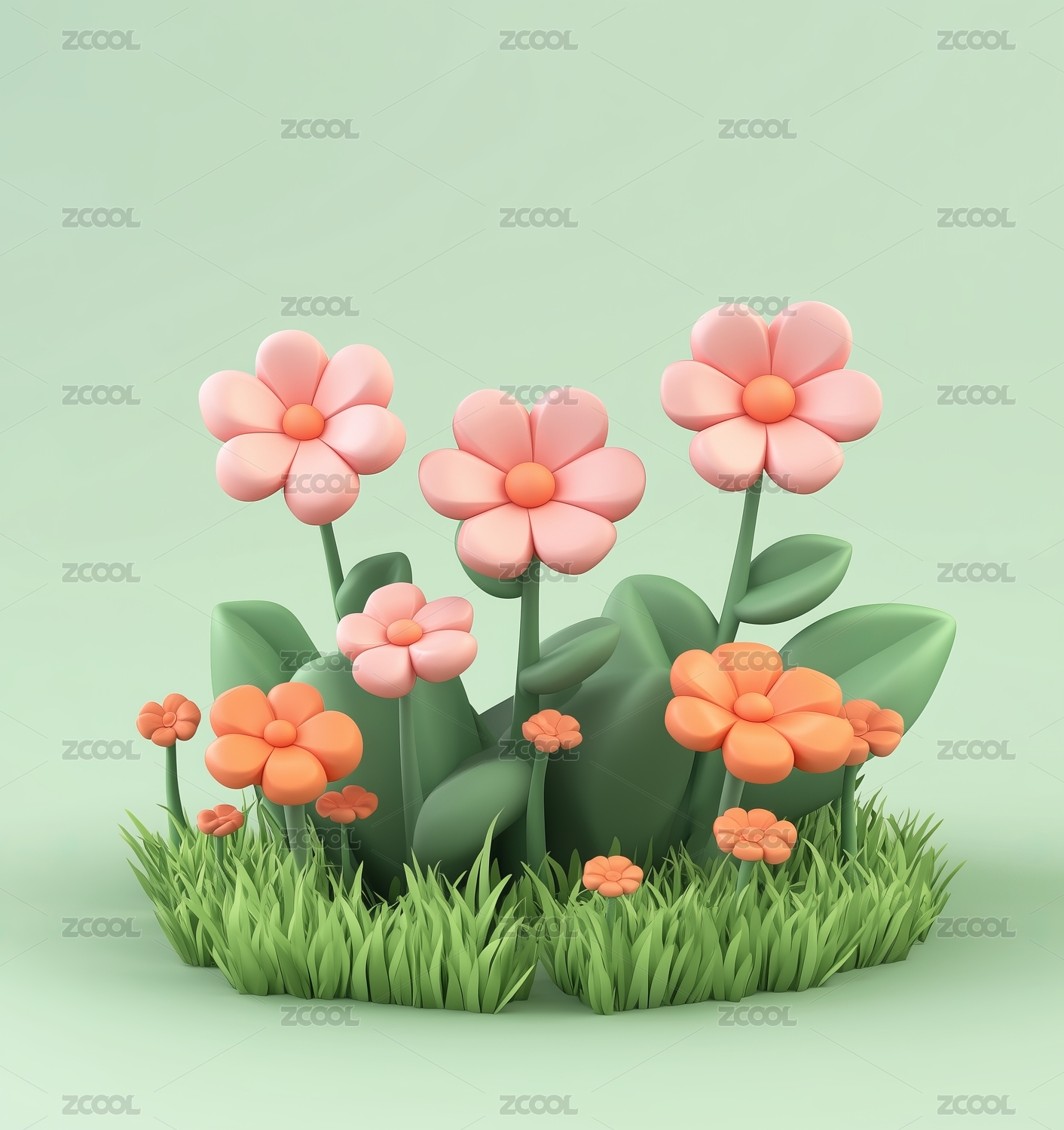 色彩鲜艳的卡通花朵与绿叶