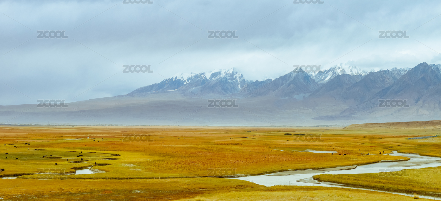 中国新疆帕米尔高原的塔合曼湿地雪山秋景