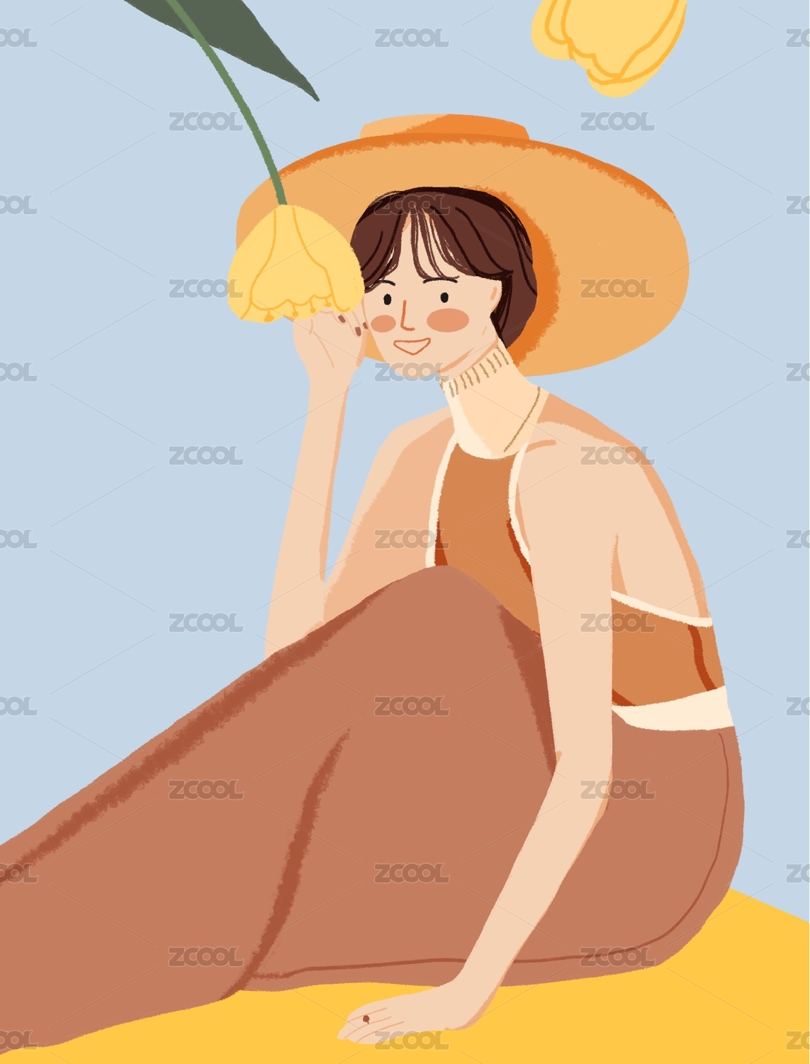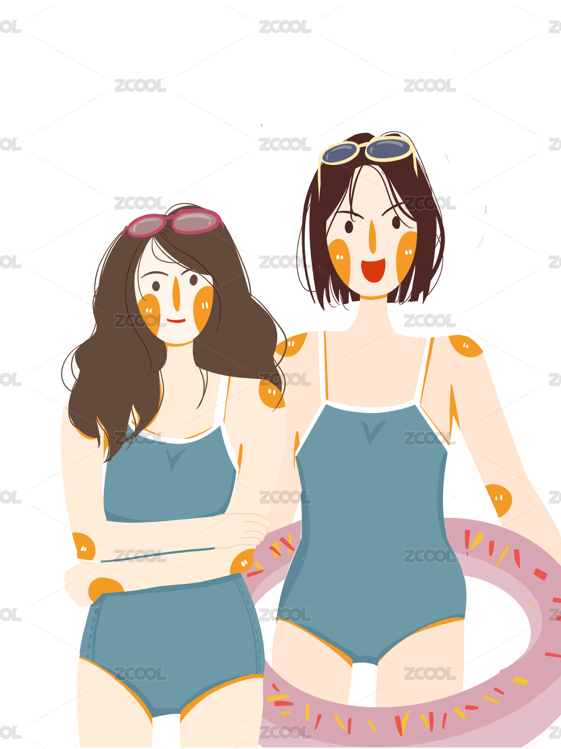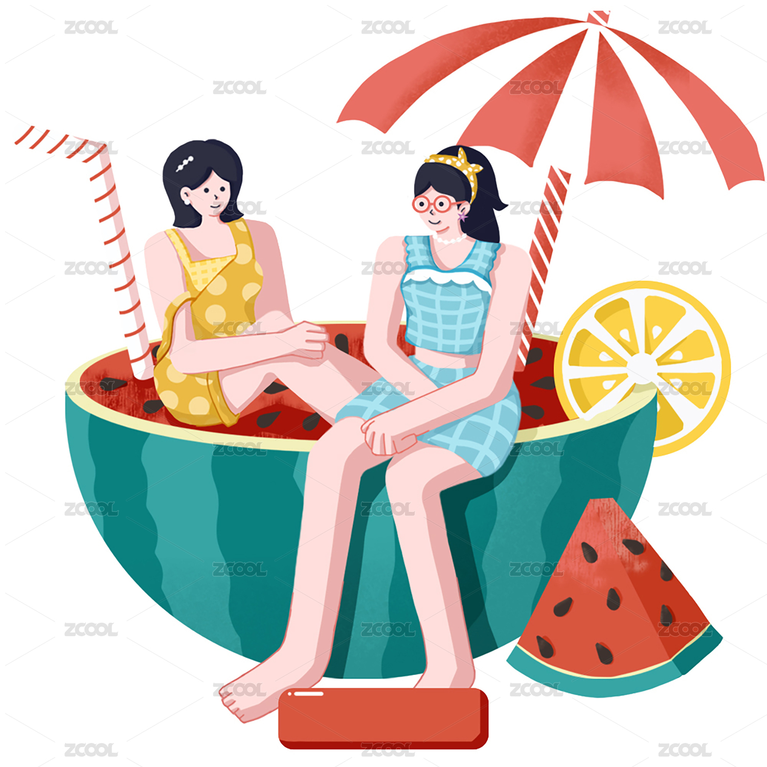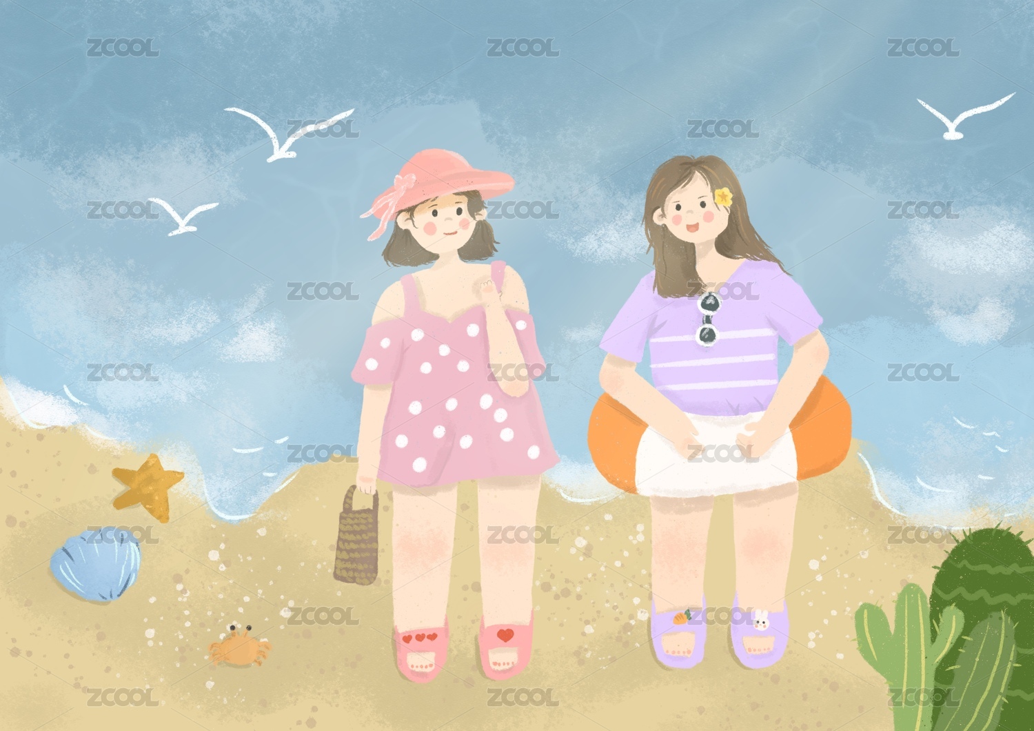 夏日女孩冷饮海滩度假扁平风肌理插画