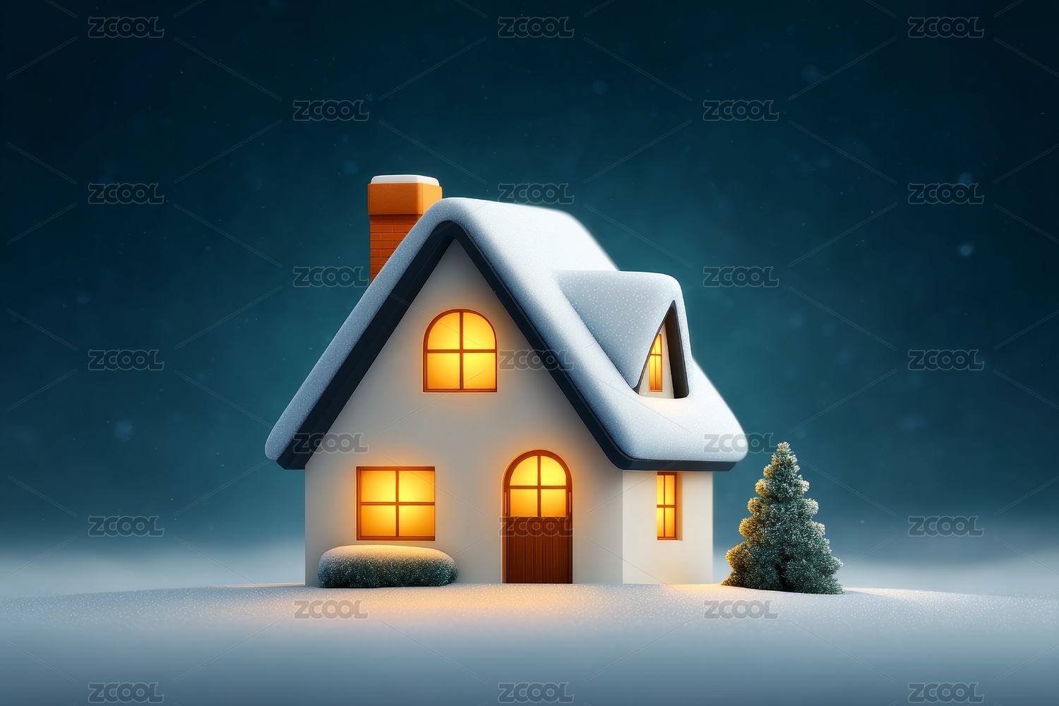 冬季,夜晚,雪地,亮着灯,小房子,建筑,房屋,景色