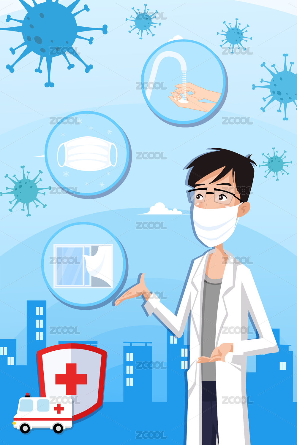 预防疫情多通风戴口罩勤洗手插画矢量图海报