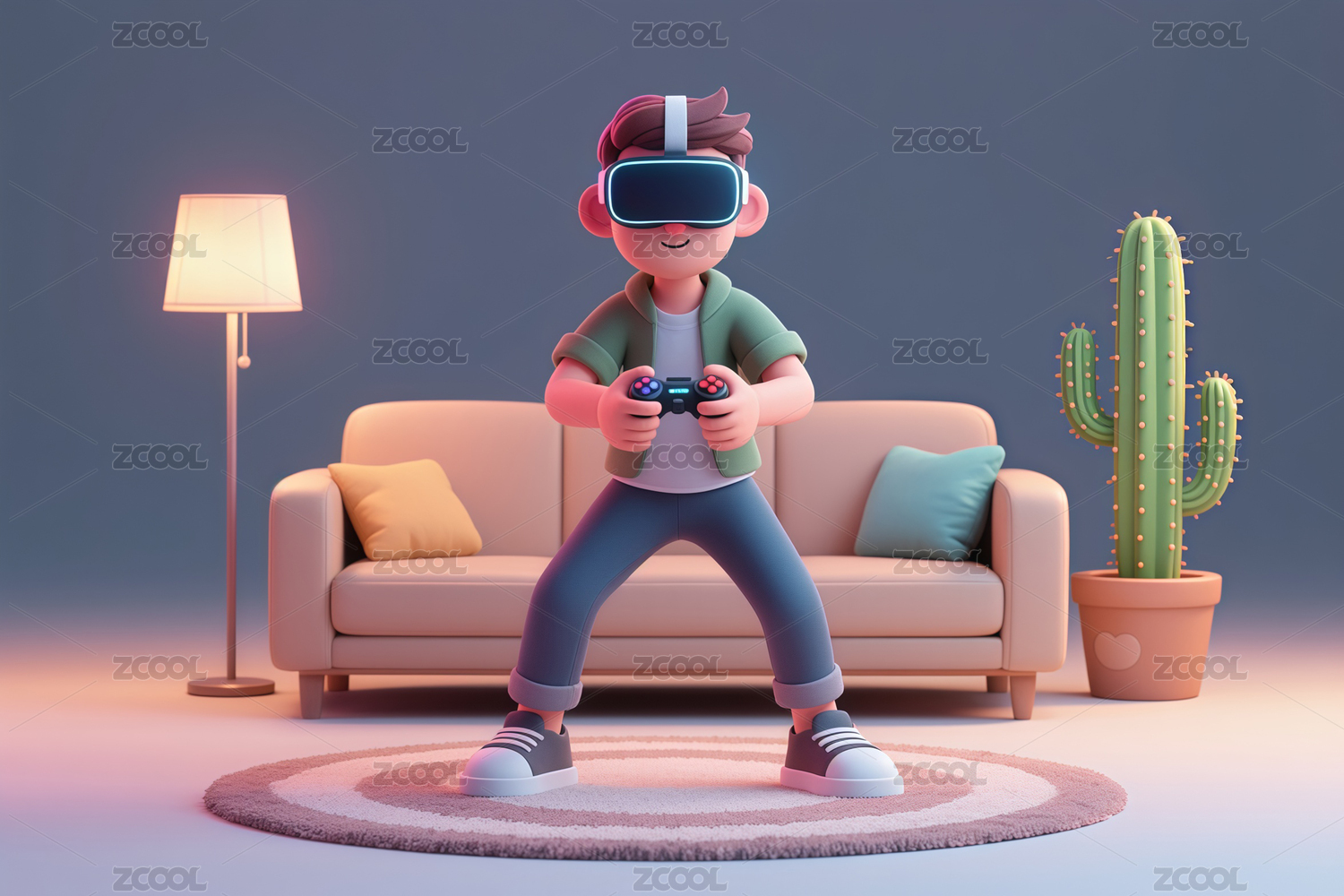 客厅里戴着VR眼镜手拿游戏手柄的男孩3D
