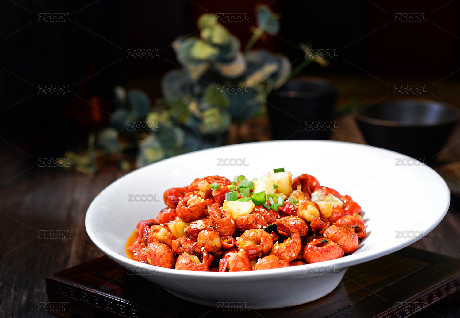 白色圆盘装的宫保大虾球摆在鹅卵石上