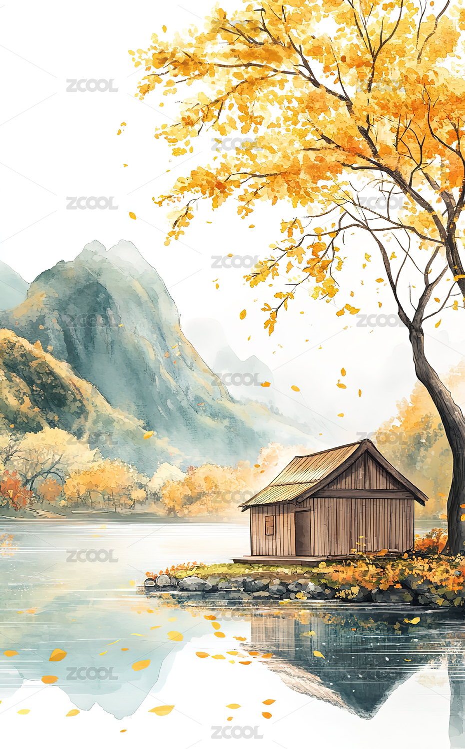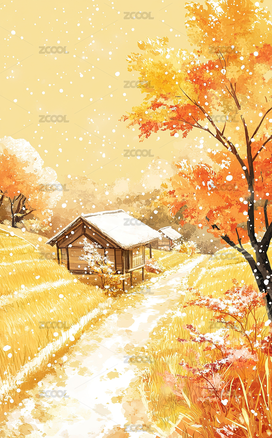 传统,秋天,雪景,农家,小院,金黄,树木,房屋,水墨,绘画