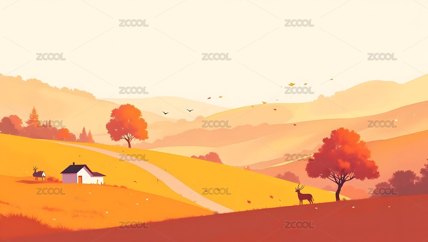 风景,自然,暖色,天空,清新,插画,宁静,远山,秋天,房屋