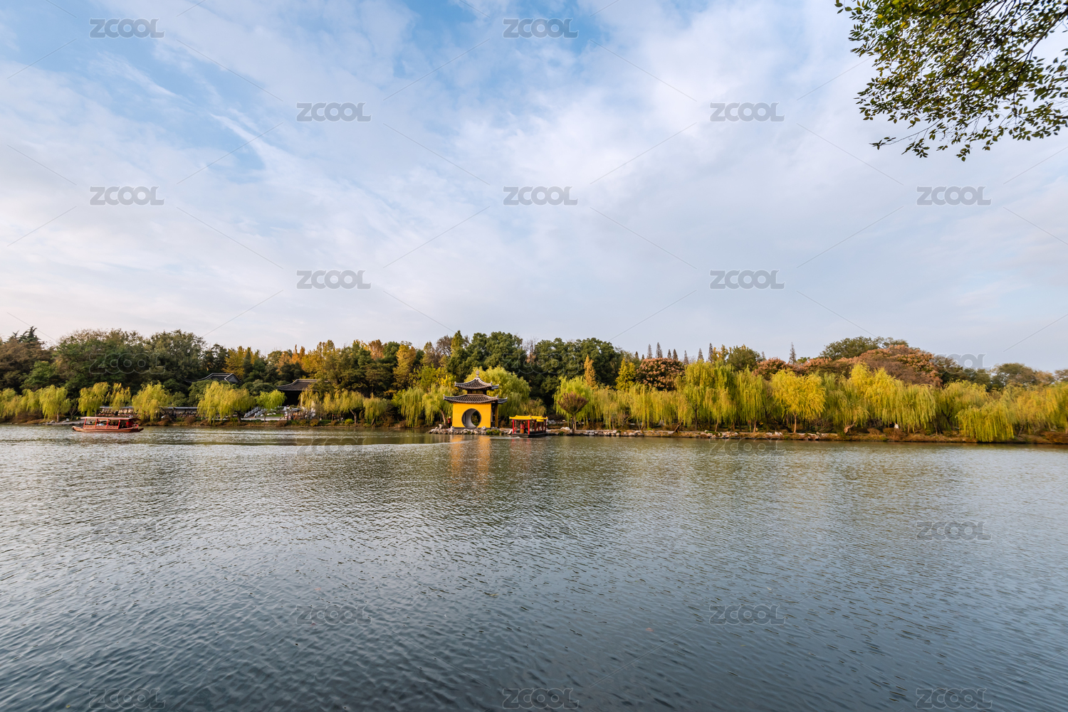 秋天中国扬州瘦西湖的河堤游船天鹅和水榭