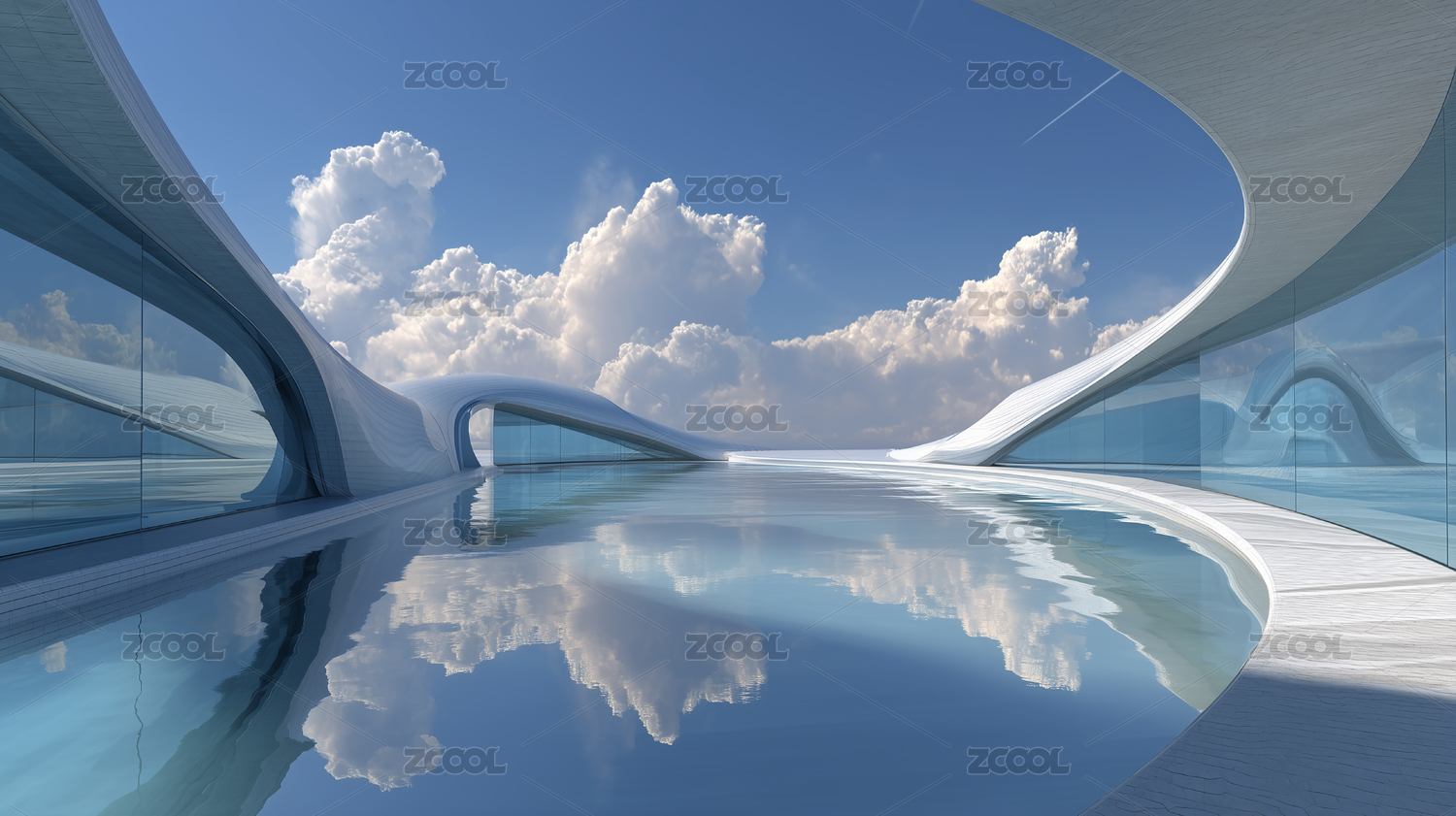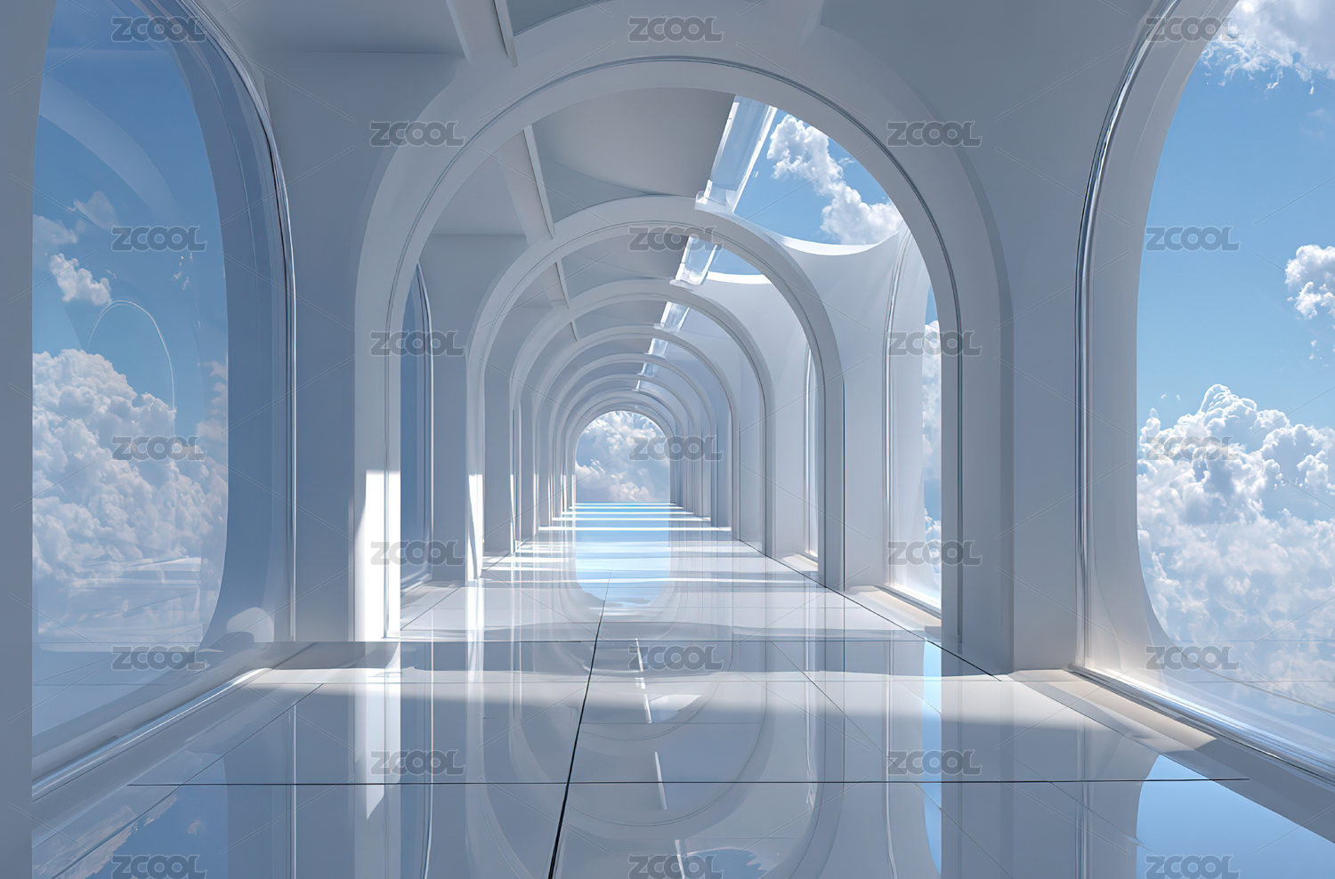 房子淡蓝色瓷砖走廊天空云朵3D插画
