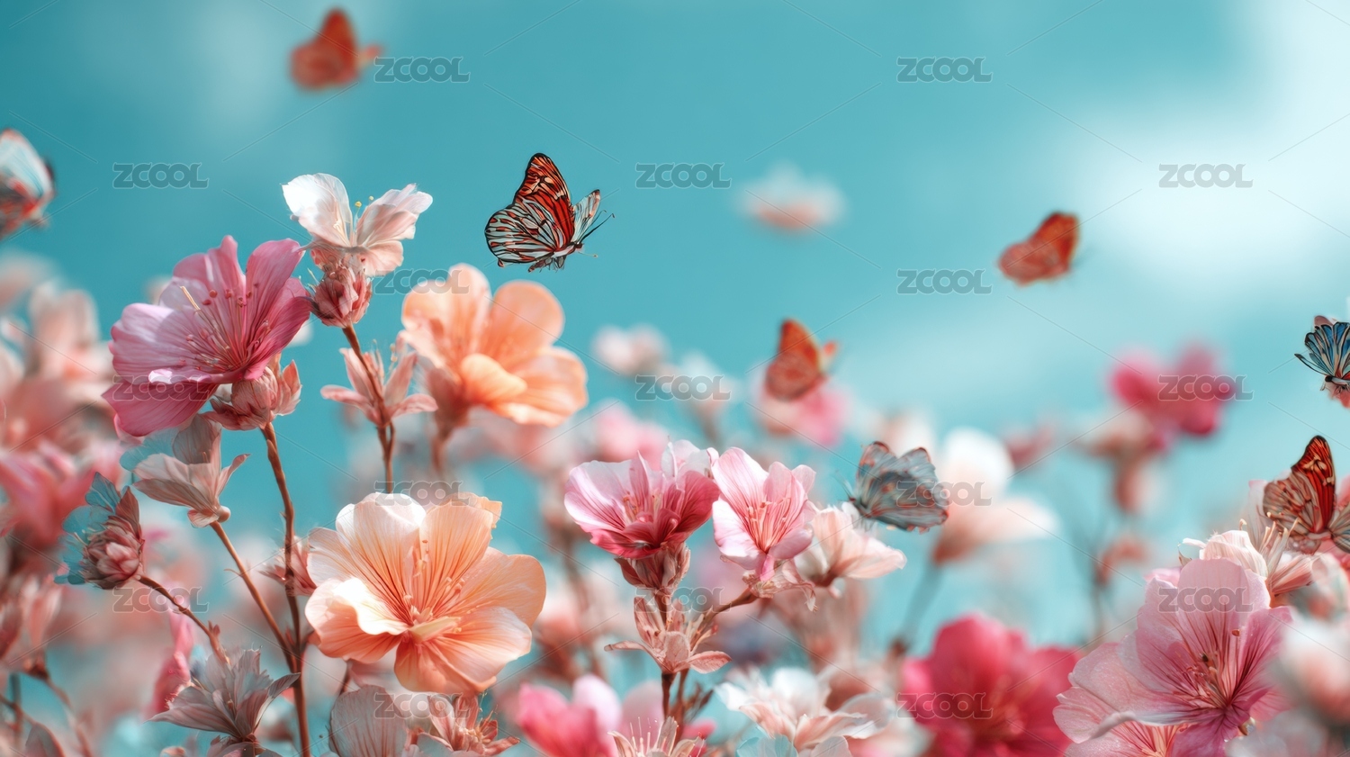蝴蝶飞舞于粉色花丛中