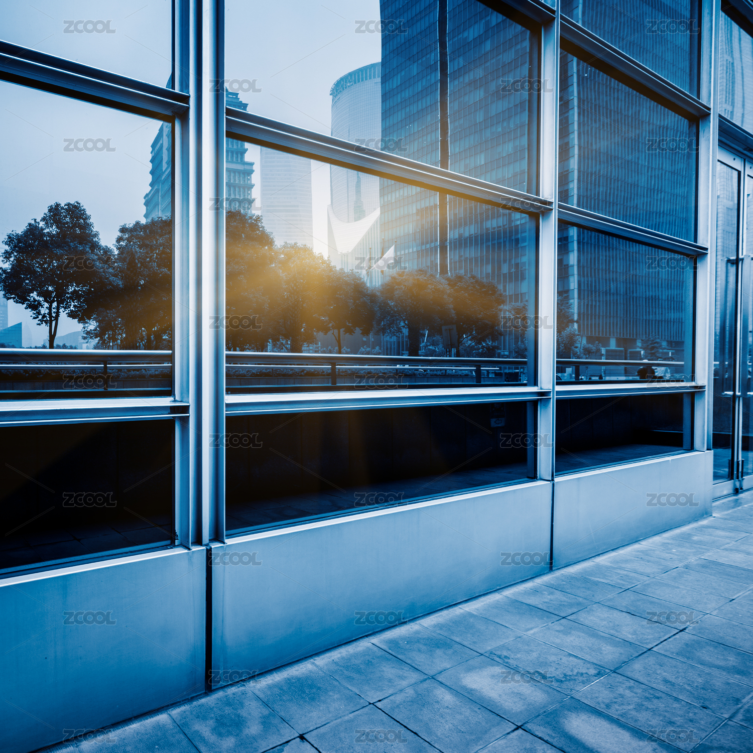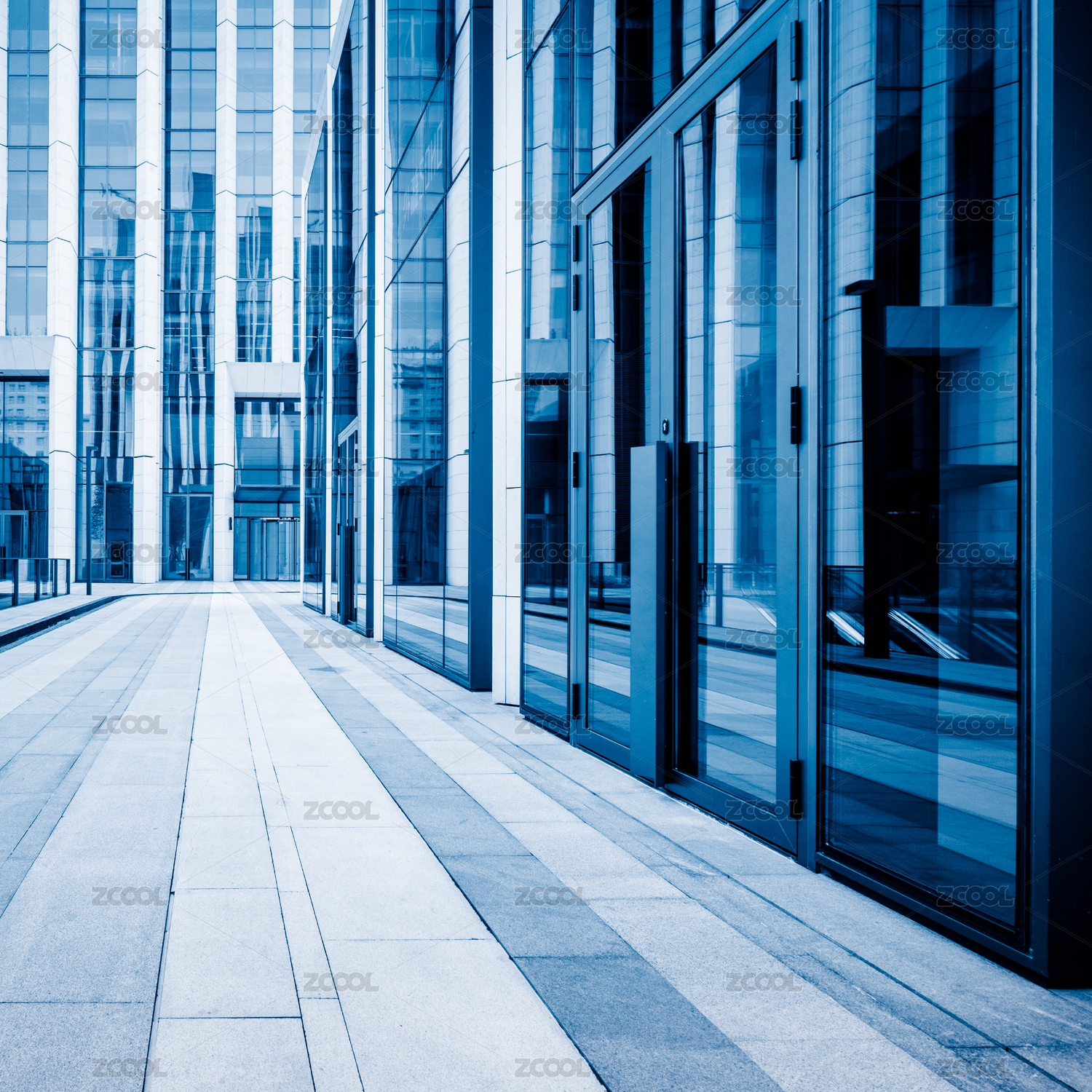 办公楼内部,蓝色色调的图像。