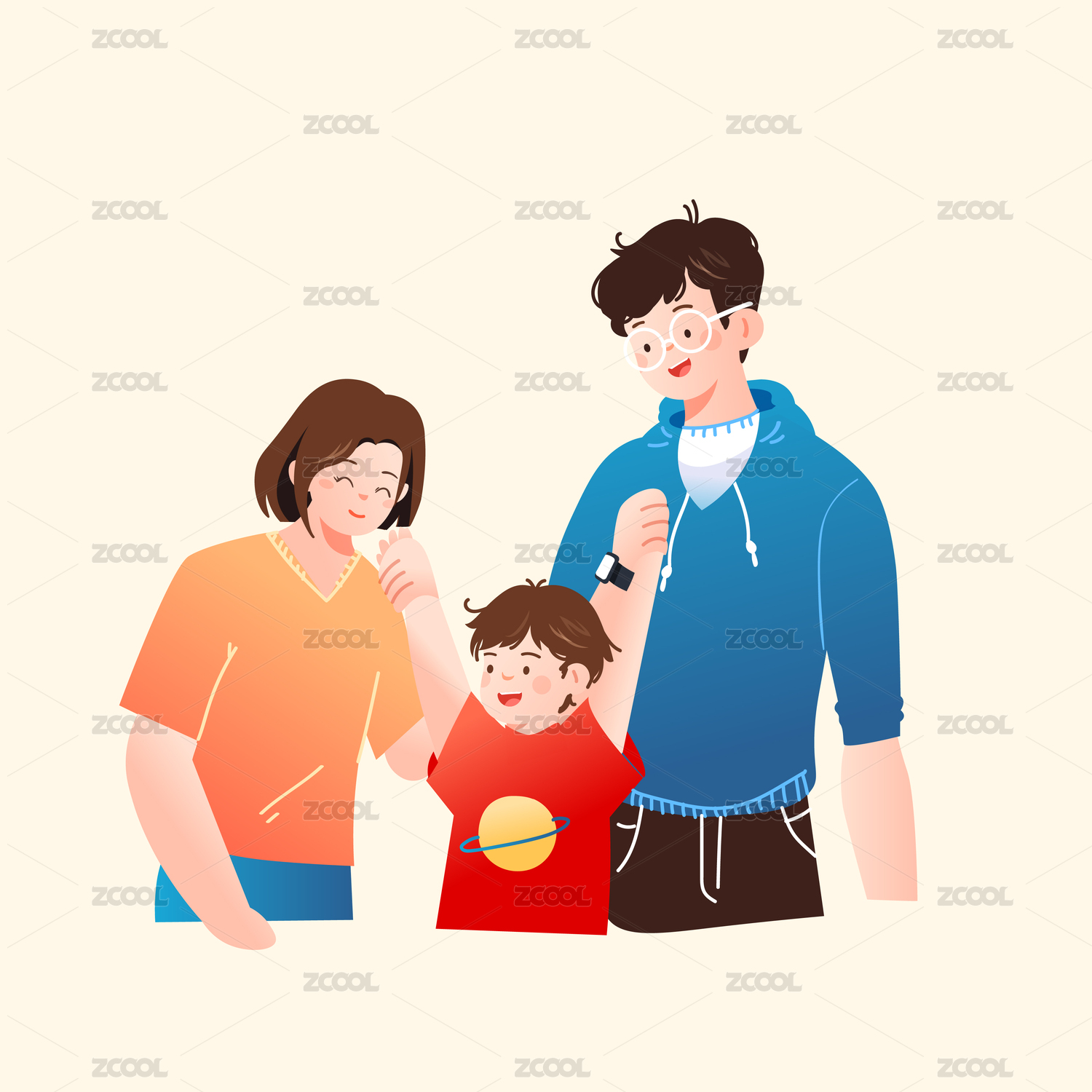 卡通手绘一家人三个人温馨相亲相爱插画