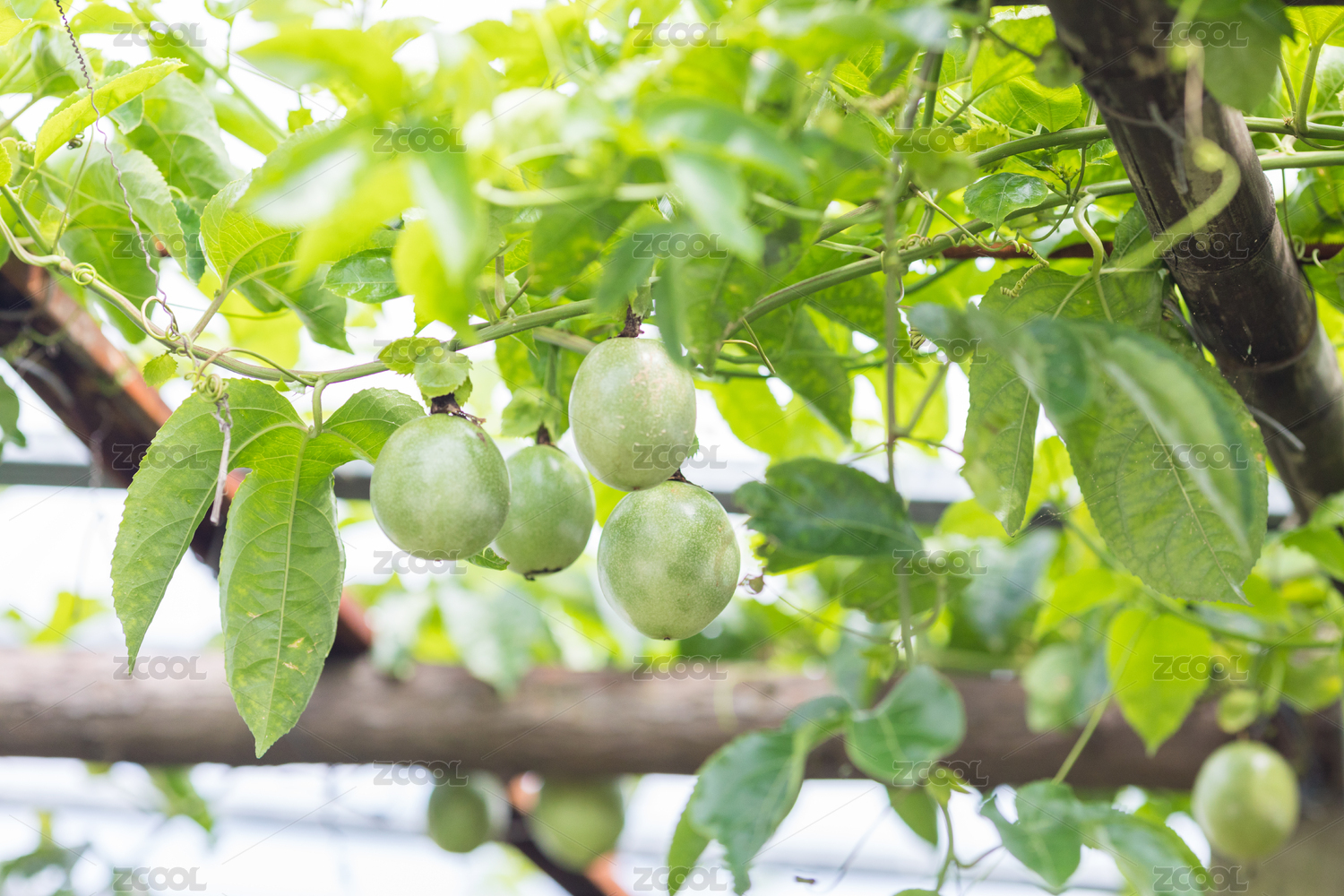 夏天百香果树藤上的一个青中带紫的新鲜百香果特写